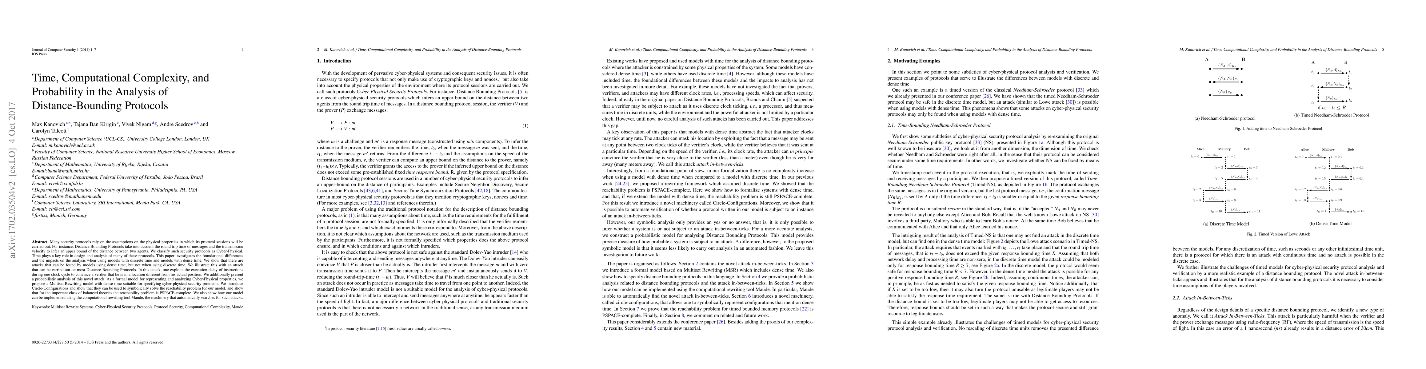 This paper explores the computational complexity and probability in analyzing Distance-Bounding Protocols, highlighting differences between discrete and dense time models. It introduces a novel attack exploiting execution delays in dense time models and proposes a Multiset Rewriting model for Cyber-Physical security protocols, demonstrating its application with Circle-Configurations and reachability analysis.