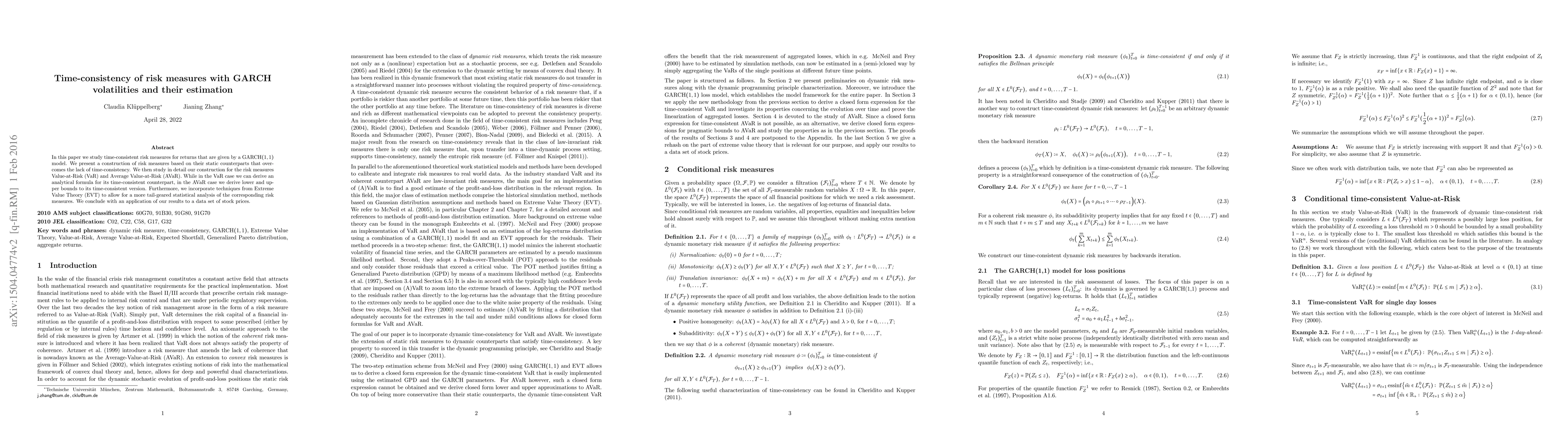 In this paper we study time-consistent risk measures for returns that are given by a GARCH(1,1) model. We present a construction of risk measures based on their static counterparts that overcomes the lack of time-consistency. We then study in detail our construction for the risk measures Value-at-Risk (VaR) and Average Value-at-Risk (AVaR). While in the VaR case we can derive an analytical formula for its time-consistent counterpart, in the AVaR case we derive lower and upper bounds to its time-consistent version. Furthermore, we incorporate techniques from Extreme Value Theory (EVT) to allow for a more tail-geared statistical analysis of the corresponding risk measures. We conclude with an application of our results to a data set of stock prices.