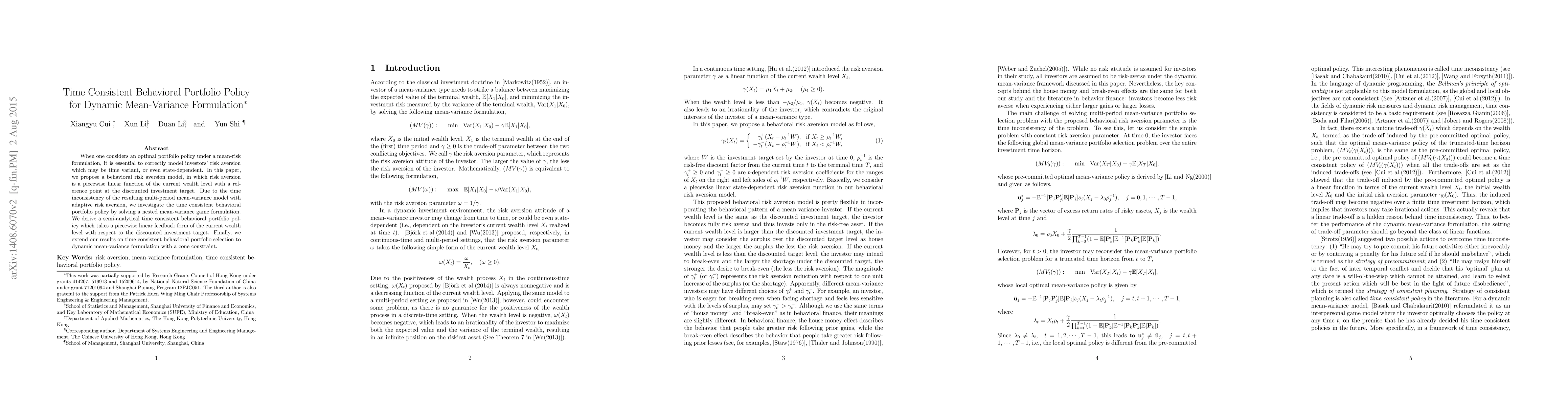 When we implement a portfolio selection methodology under a mean-risk formulation, it is essential to correctly model investors' risk aversion which may be time-dependent, or even state-dependent during the investment procedure. In this paper, we propose a behavior risk aversion model, which is a piecewise linear function of the current wealth level with a reference point at a preset investment target. Due to the time inconsistency of the resulting multi-period mean-variance model with an adaptive risk aversion, we investigate in this paper the time consistent behavior portfolio policy by solving a nested mean-variance game formulation. We derive semi-analytical time consistent behavior portfolio policy which takes a piecewise linear feedback form of the current wealth level with respect to the discounted investment target.
