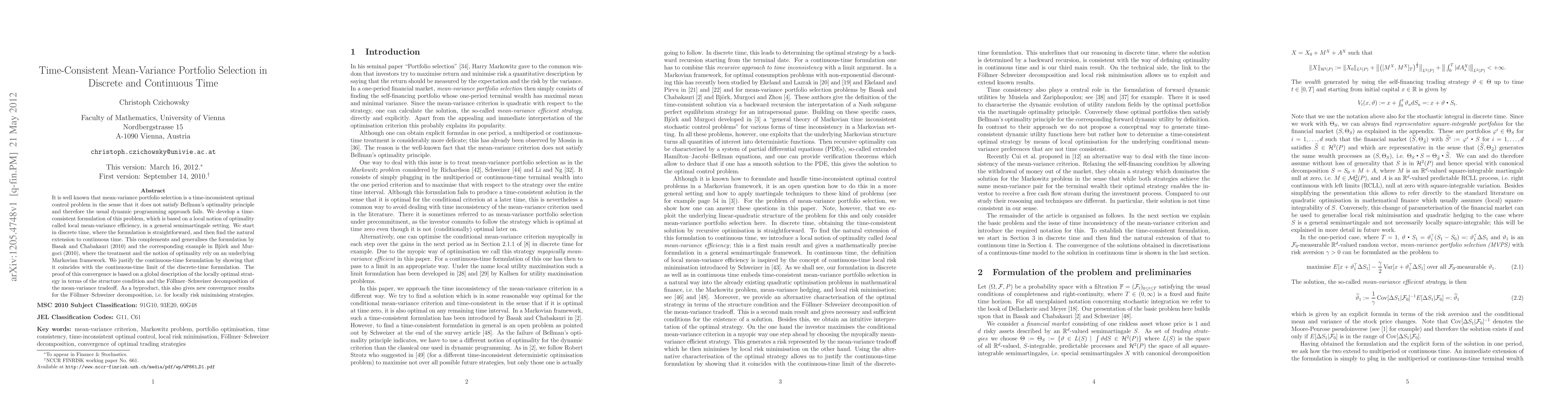This paper develops a time-consistent formulation for mean-variance portfolio selection, addressing the time inconsistency issue in traditional dynamic programming approaches. It introduces a local mean-variance efficiency concept and extends the formulation from discrete to continuous time, providing a convergence proof based on the Föllmer-Schweizer decomposition.