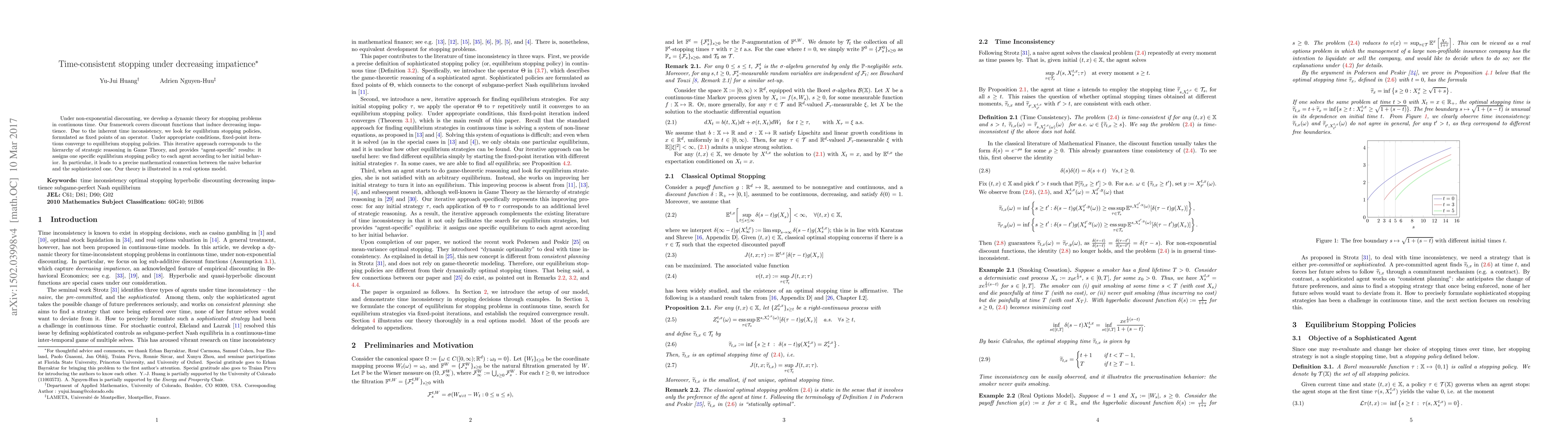 Under non-exponential discounting, we develop a dynamic theory for stopping problems in continuous time. Our framework covers discount functions that induce decreasing impatience. Due to the inherent time inconsistency, we look for equilibrium stopping policies, formulated as fixed points of an operator. Under appropriate conditions, fixed-point iterations converge to equilibrium stopping policies. This iterative approach corresponds to the hierarchy of strategic reasoning in Game Theory, and provides "agent-specific" results: it assigns one specific equilibrium stopping policy to each agent according to her initial behavior. In particular, it leads to a precise mathematical connection between the naive behavior and the sophisticated one. Our theory is illustrated in a real options model.