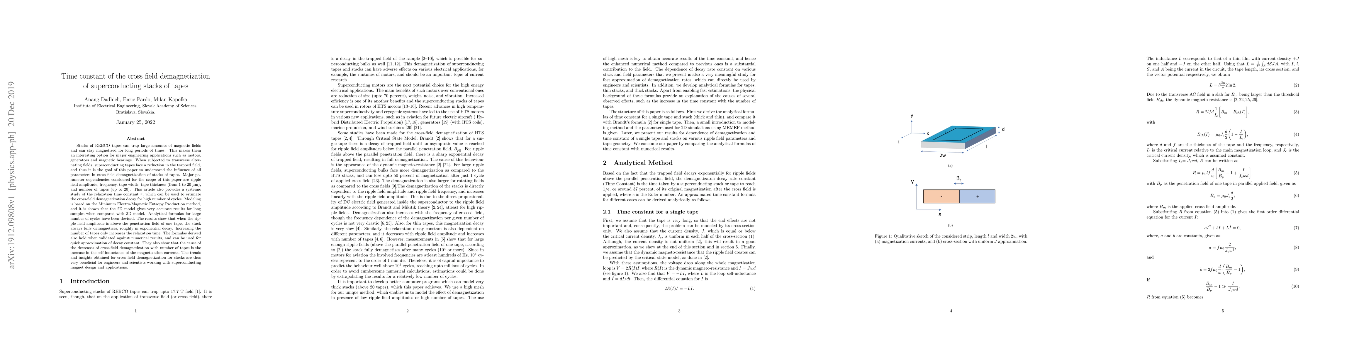 This paper investigates the time constant of cross field demagnetization in stacks of REBCO tapes, focusing on parameters like ripple field amplitude, frequency, and tape dimensions. Analytical formulas and a 2D model are developed to predict the decay of trapped magnetic fields, revealing that increased tape numbers extend relaxation time due to higher self-inductance.