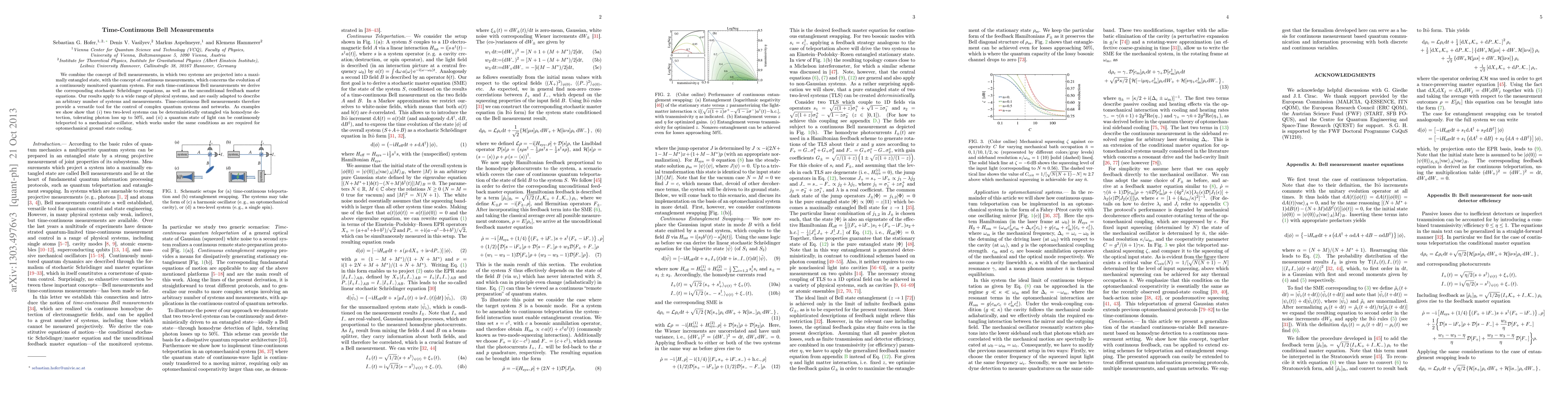 This paper develops time-continuous Bell measurements, merging Bell measurements with continuous quantum monitoring, and provides stochastic equations for their evolution. It demonstrates applications in entangling two-level systems and continuously teleporting quantum states to mechanical oscillators, highlighting their utility in controlling complex quantum systems.