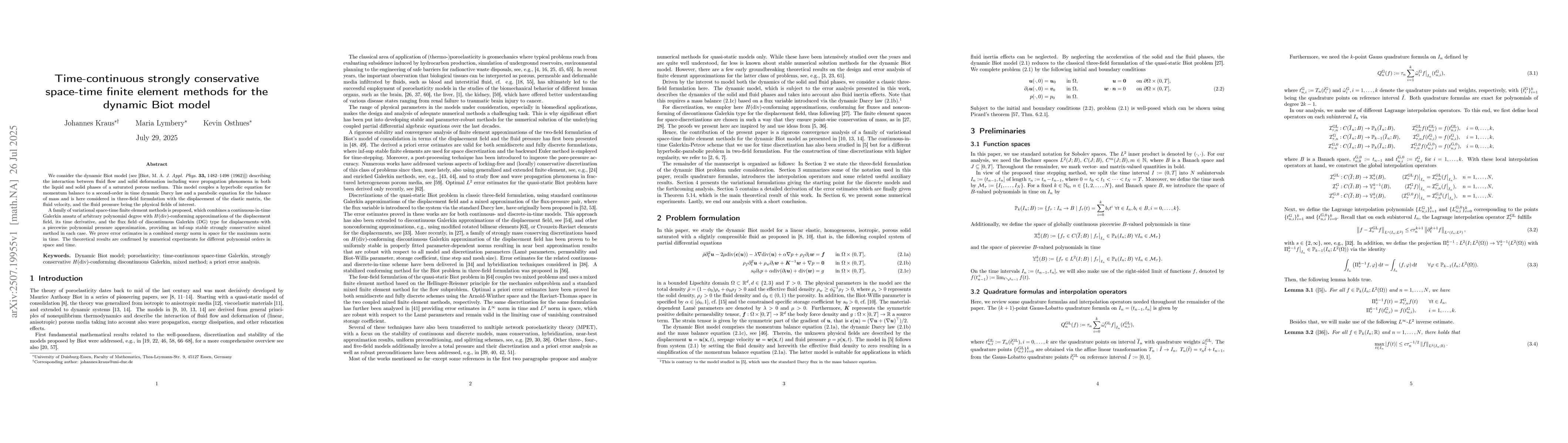 We consider the dynamic Biot model (see [Biot, M. A. J. Appl. Phys. 33, 1482--1498 (1962)]) describing the interaction between fluid flow and solid deformation including wave propagation phenomena in both the liquid and solid phases of a saturated porous medium. This model couples a hyperbolic equation for momentum balance to a second-order in time dynamic Darcy law and a parabolic equation for the balance of mass and is here considered in three-field formulation with the displacement of the elastic matrix, the fluid velocity, and the fluid pressure being the physical fields of interest. A family of variational space-time finite element methods is proposed, which combines a continuous-in-time Galerkin ansatz of arbitrary polynomial degree with $H(\mathrm{div})$-conforming approximations of the displacement field, its time derivative, and the flux field--of discontinuous Galerkin (DG) type for displacements--with a piecewise polynomial pressure approximation, providing an inf-sup stable strongly conservative mixed method in each case. We prove error estimates in a combined energy norm in space for the maximum norm in time. The theoretical results are confirmed by numerical experiments for different polynomial orders in space and time.