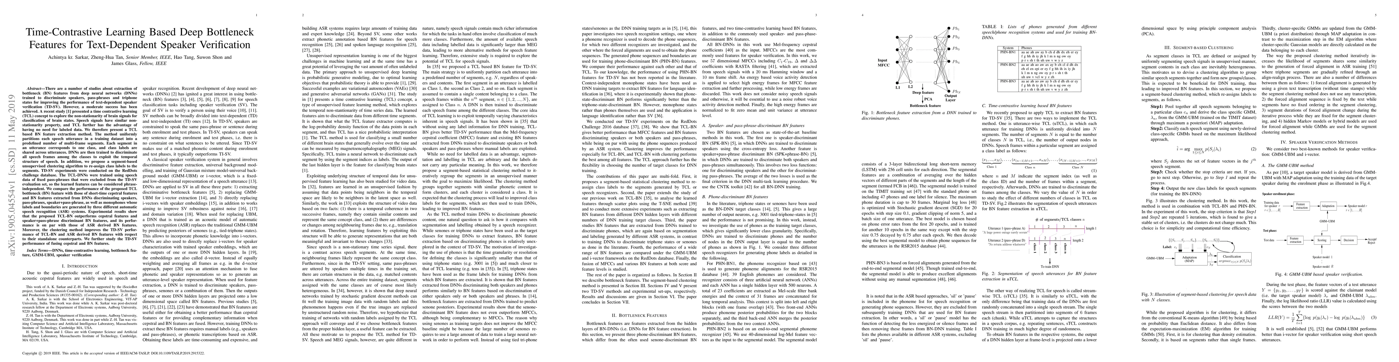 There are a number of studies about extraction of bottleneck (BN) features from deep neural networks (DNNs)trained to discriminate speakers, pass-phrases and triphone states for improving the performance of text-dependent speaker verification (TD-SV). However, a moderate success has been achieved. A recent study [1] presented a time contrastive learning (TCL) concept to explore the non-stationarity of brain signals for classification of brain states. Speech signals have similar non-stationarity property, and TCL further has the advantage of having no need for labeled data. We therefore present a TCL based BN feature extraction method. The method uniformly partitions each speech utterance in a training dataset into a predefined number of multi-frame segments. Each segment in an utterance corresponds to one class, and class labels are shared across utterances. DNNs are then trained to discriminate all speech frames among the classes to exploit the temporal structure of speech. In addition, we propose a segment-based unsupervised clustering algorithm to re-assign class labels to the segments. TD-SV experiments were conducted on the RedDots challenge database. The TCL-DNNs were trained using speech data of fixed pass-phrases that were excluded from the TD-SV evaluation set, so the learned features can be considered phrase-independent. We compare the performance of the proposed TCL bottleneck (BN) feature with those of short-time cepstral features and BN features extracted from DNNs discriminating speakers, pass-phrases, speaker+pass-phrase, as well as monophones whose labels and boundaries are generated by three different automatic speech recognition (ASR) systems. Experimental results show that the proposed TCL-BN outperforms cepstral features and speaker+pass-phrase discriminant BN features, and its performance is on par with those of ASR derived BN features. Moreover,....