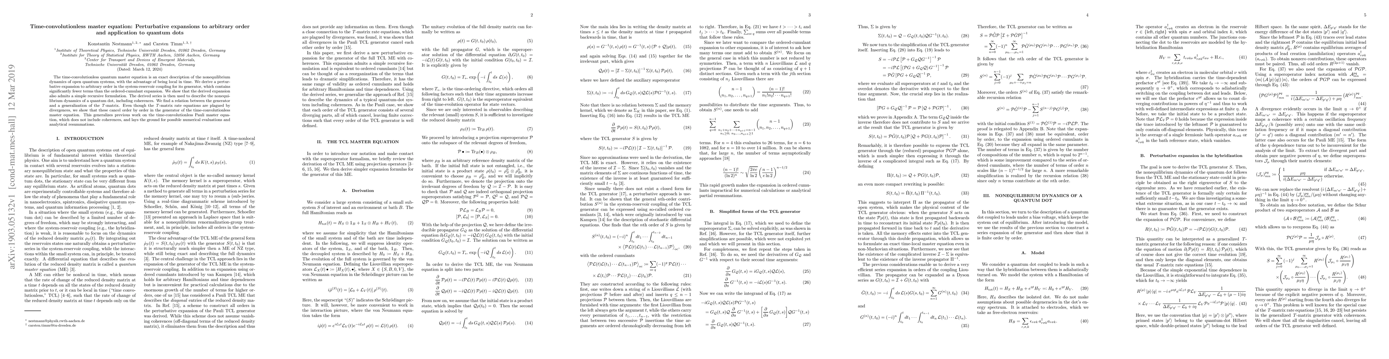 This paper develops a time-convolutionless quantum master equation for open quantum systems, providing a perturbative expansion to arbitrary order that simplifies calculations. It applies this to quantum dots, revealing a cancellation of divergences in $T$-matrix rate equations, thus extending previous work and enabling potential numerical and analytical advancements.
