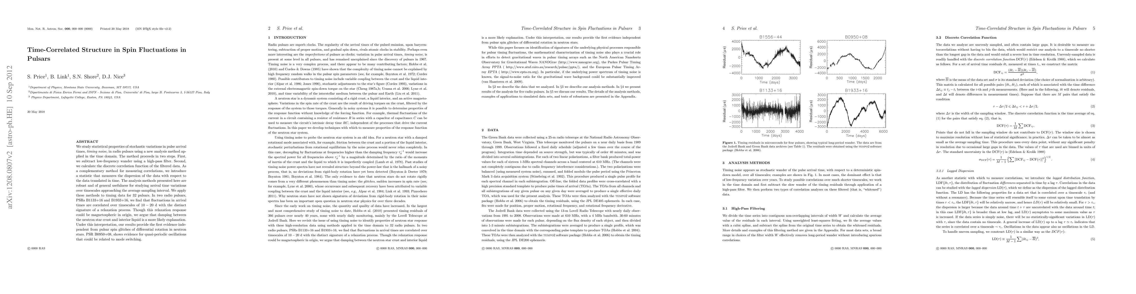 We study statistical properties of stochastic variations in pulse arrival times, timing noise, in radio pulsars using a new analysis method applied in the time domain. The method proceeds in two steps. First, we subtract low-frequency wander using a high-pass filter. Second, we calculate the discrete correlation function of the filtered data. As a complementary method for measuring correlations, we introduce a statistic that measures the dispersion of the data with respect to the data translated in time. The analysis methods presented here are robust and of general usefulness for studying arrival time variations over timescales approaching the average sampling interval. We apply these methods to timing data for 32 pulsars. In two radio pulsars, PSRs B1133+16 and B1933+16, we find that fluctuations in arrival times are correlated over timescales of 10 - 20 d with the distinct signature of a relaxation process. Though this relaxation response could be magnetospheric in origin, we argue that damping between the neutron star crust and interior liquid is a more likely explanation. Under this interpretation, our results provide the first evidence independent from pulsar spin glitches of differential rotation in neutron stars. PSR B0950+08, shows evidence for quasi-periodic oscillations that could be related to mode switching.