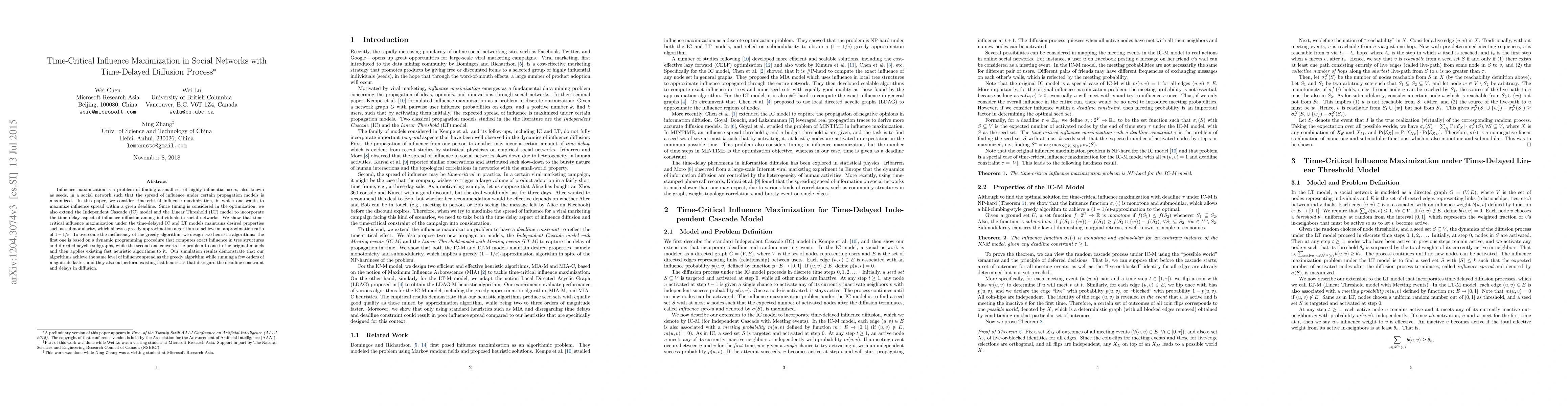 This paper addresses time-critical influence maximization in social networks, optimizing influence spread within a given deadline by extending the Independent Cascade and Linear Threshold models to account for time delays. It proposes efficient heuristic algorithms that achieve comparable influence spread to the greedy algorithm but run significantly faster.