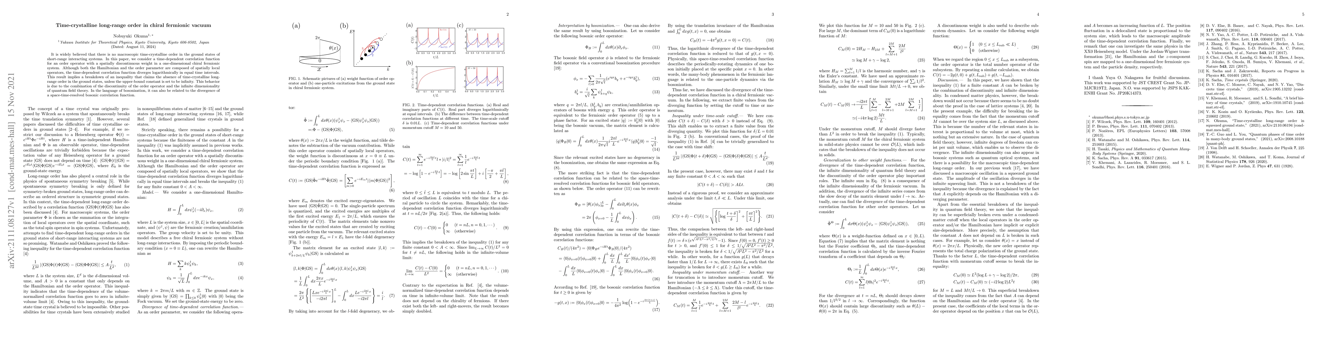 Researchers found that a specific type of time-dependent correlation function in a one-dimensional chiral fermionic system diverges logarithmically, challenging the long-held assumption that there is no macroscopic time-crystalline order in ground states. This discovery implies a possible breakdown of an inequality claiming the absence of such order.
