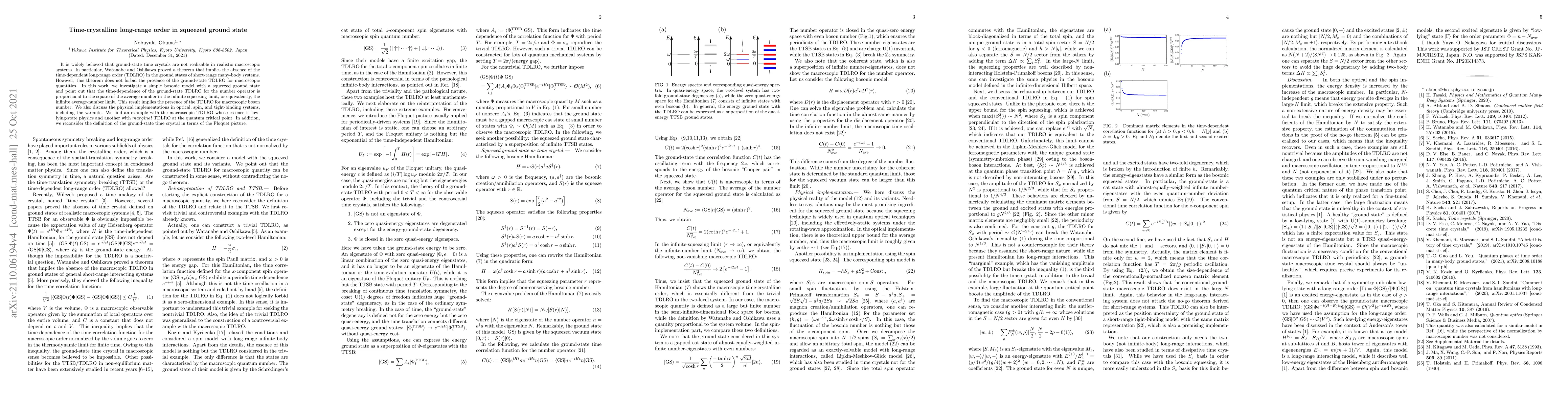 It is widely believed that ground-state time crystals are not realizable in realistic macroscopic systems. In particular, Watanabe and Oshikawa proved a theorem that implies the absence of the time-dependent long-range order (TDLRO) in the ground states of short-range many-body systems. However, this theorem does not forbid the presence of the ground-state TDLRO for macroscopic quantities. In this work, we investigate a simple bosonic model with a squeezed ground state and point out that the time-dependence of the ground-state TDLRO for the number operator is proportional to the square of the average number in the infinite-squeezing limit, or equivalently, the infinite average-number limit. This result implies the presence of the TDLRO for macroscopic boson number. We also discuss the physical implementations in optical, spin, and tight-binding systems, including the variants. We find an example with the macroscopic TDLRO whose essence is low-lying-state physics and another with $marginal$ TDLRO at the quantum critical point. In addition, we reconsider the definition of the ground-state time crystal in terms of the Floquet picture.