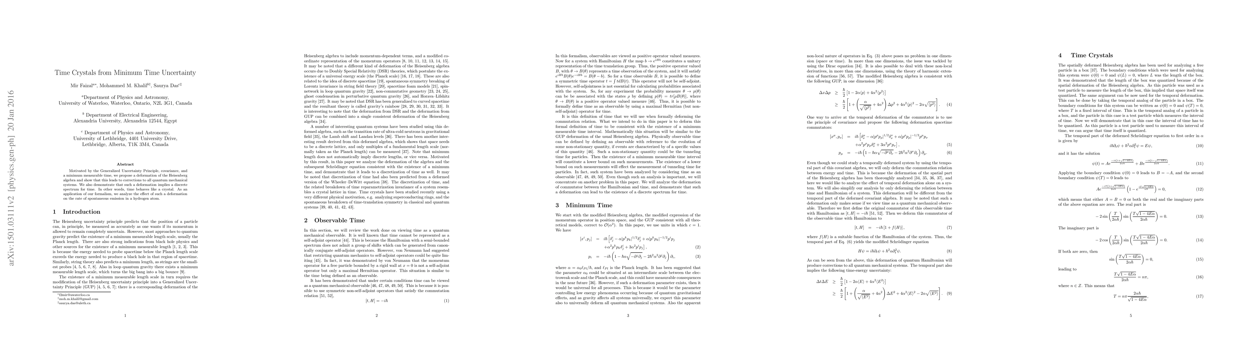 Motivated by the Generalized Uncertainty Principle, covariance, and a minimum measurable time, we propose a deformation of the Heisenberg algebra and show that this leads to corrections to all quantum mechanical systems. We also demonstrate that such a deformation implies a discrete spectrum for time. In other words, time behaves like a crystal. As an application of our formalism, we analyze the effect of such a deformation on the rate of spontaneous emission in a hydrogen atom.