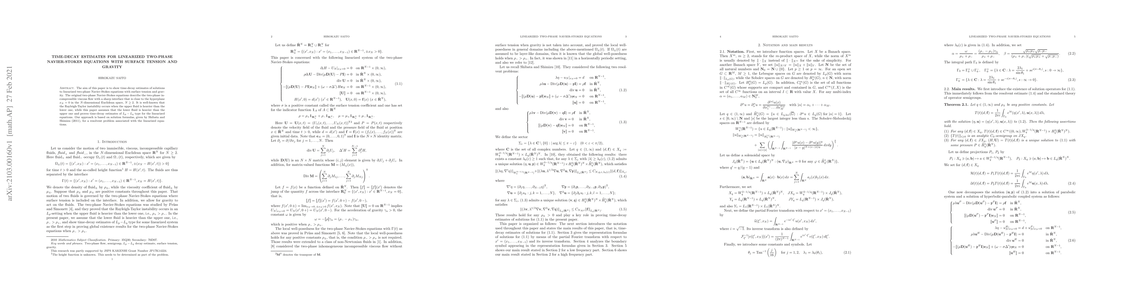 This paper investigates time-decay estimates for solutions to linearized two-phase Navier-Stokes equations with surface tension and gravity, focusing on scenarios where the lower fluid is heavier than the upper one. The study employs solution formulas for a resolvent problem to derive $L_p-L_q$ type decay estimates.