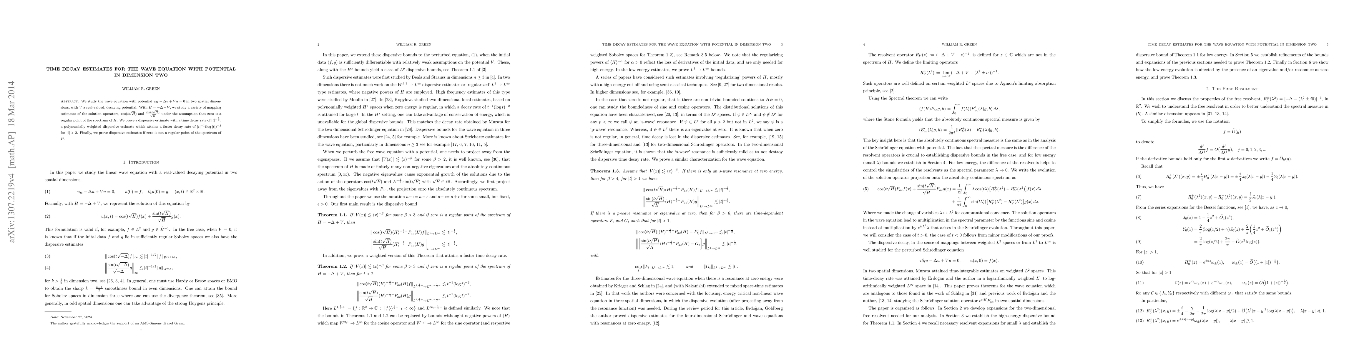 This paper investigates the wave equation with a decaying potential in two dimensions, proving time decay estimates for the solution operators under various spectral assumptions. It establishes a dispersive estimate with a $|t|^{-\frac{1}{2}}$ decay rate and a faster weighted estimate for $|t|>2$.