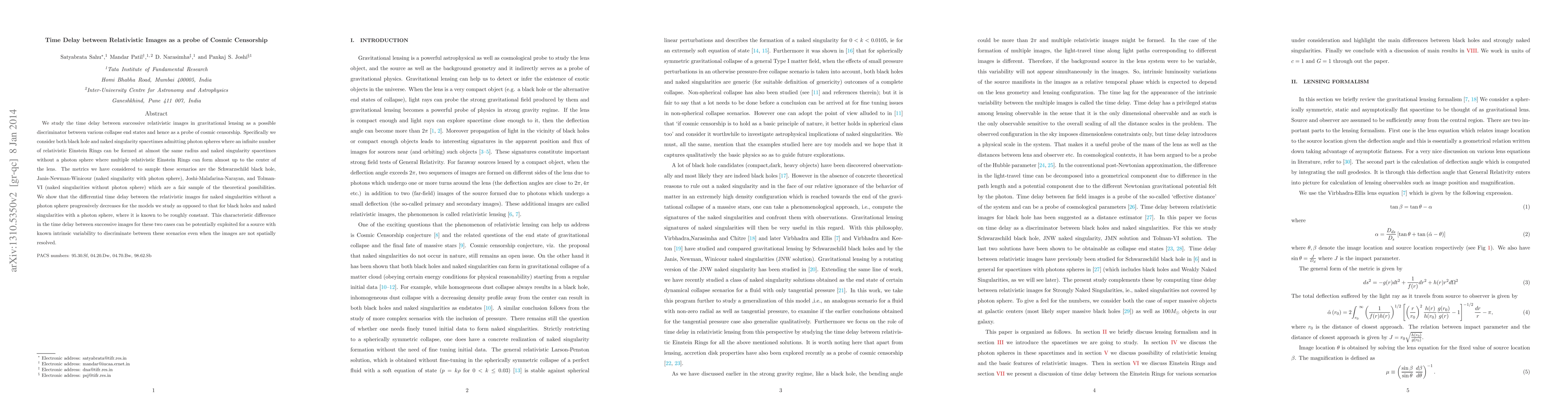 This paper investigates the time delay between relativistic images in gravitational lensing to distinguish between black hole and naked singularity end states of collapse, serving as a probe of cosmic censorship. It finds that the time delay decreases progressively for naked singularities without photon spheres, contrasting with the roughly constant delay for black holes and naked singularities with photon spheres.