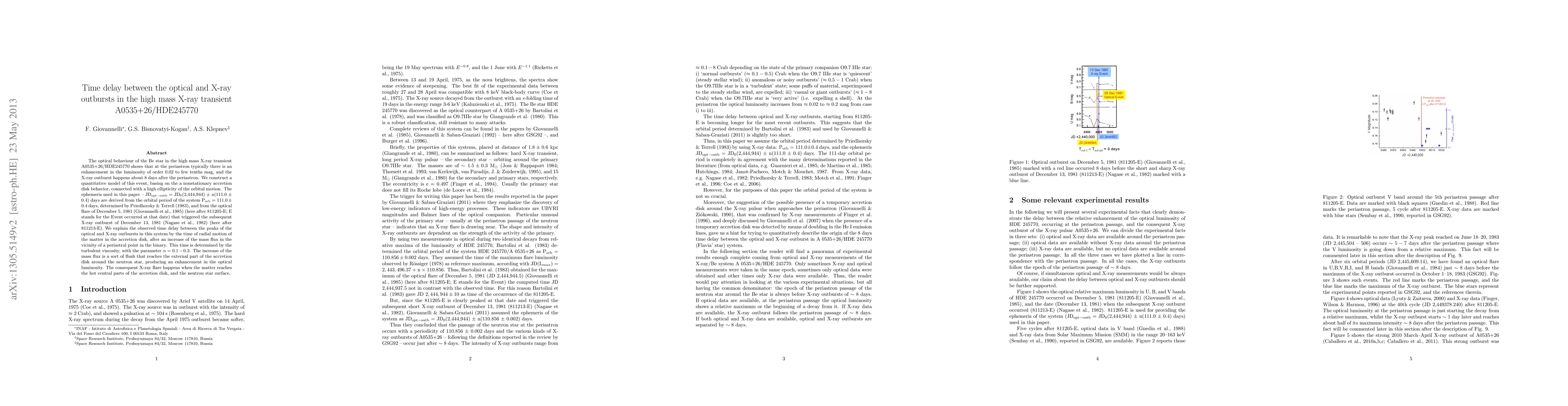The optical behaviour of the Be star in the high mass X-ray transient A0535+26/HDE245770 shows that at the periastron typically there is an enhancement in the luminosity of order 0.02 to few tenths mag, and the X-ray outburst happens about 8 days after the periastron. We construct a quantitative model of this event, basing on the a nonstationary accretion disk behavior, connected with a high ellipticity of the orbital motion. The ephemeris used in this paper -- JD$_{\rm opt-outb}$ = JD$_0$(2,444,944) $\pm$ n(111.0 $\pm$ 0.4) days are derived from the orbital period of the system P$_{\rm orb} = 111.0 \pm 0.4$ days, determined by Priedhorsky & Terrell (1983), and from the optical flare of December 5, 1981 (Giovannelli et al., 1985) (here after 811205-E; E stands for the Event occurred at that date) that triggered the subsequent X-ray outburst of December 13, 1981 (Nagase et al., 1982) (here after 811213-E). We explain the observed time delay between the peaks of the optical and X-ray outbursts in this system by the time of radial motion of the matter in the accretion disk, after an increase of the mass flux in the vicinity of a periastral point in the binary. This time is determined by the turbulent viscosity, with the parameter $\alpha=0.1-0.3$. The increase of the mass flux is a sort of flush that reaches the external part of the accretion disk around the neutron star, producing an enhancement in the optical luminosity. The consequent X-ray flare happens when the matter reaches the hot central parts of the accretion disk, and the neutron star surface.