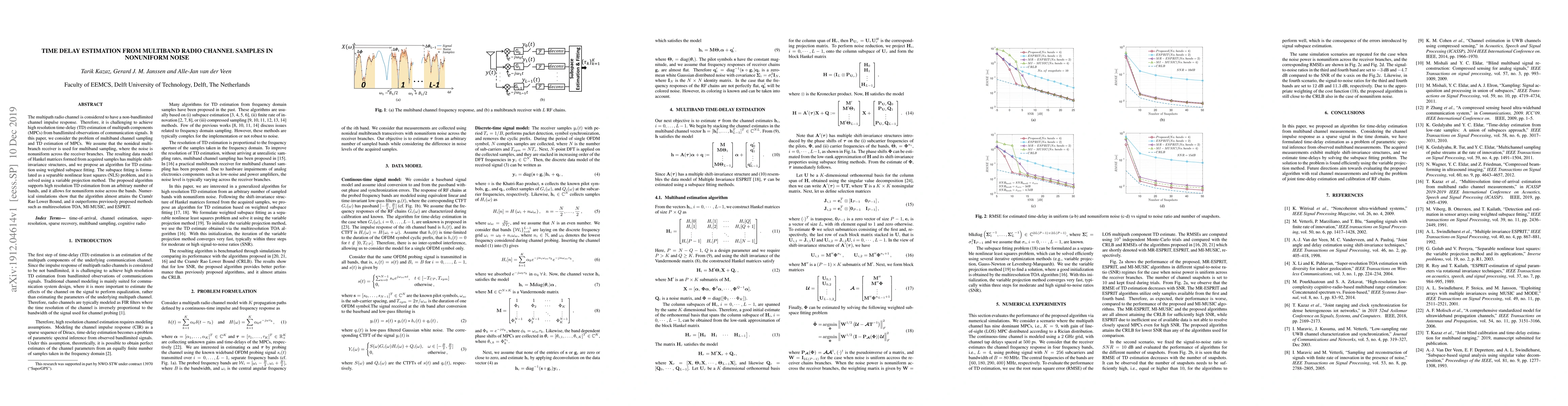 The multipath radio channel is considered to have a non-bandlimited channel impulse response. Therefore, it is challenging to achieve high resolution time-delay (TD) estimation of multipath components (MPCs) from bandlimited observations of communication signals. It this paper, we consider the problem of multiband channel sampling and TD estimation of MPCs. We assume that the nonideal multibranch receiver is used for multiband sampling, where the noise is nonuniform across the receiver branches. The resulting data model of Hankel matrices formed from acquired samples has multiple shift-invariance structures, and we propose an algorithm for TD estimation using weighted subspace fitting. The subspace fitting is formulated as a separable nonlinear least squares (NLS) problem, and it is solved using a variable projection method. The proposed algorithm supports high resolution TD estimation from an arbitrary number of bands, and it allows for nonuniform noise across the bands. Numerical simulations show that the algorithm almost attains the Cramer Rao Lower Bound, and it outperforms previously proposed methods such as multiresolution TOA, MI-MUSIC, and ESPRIT.
