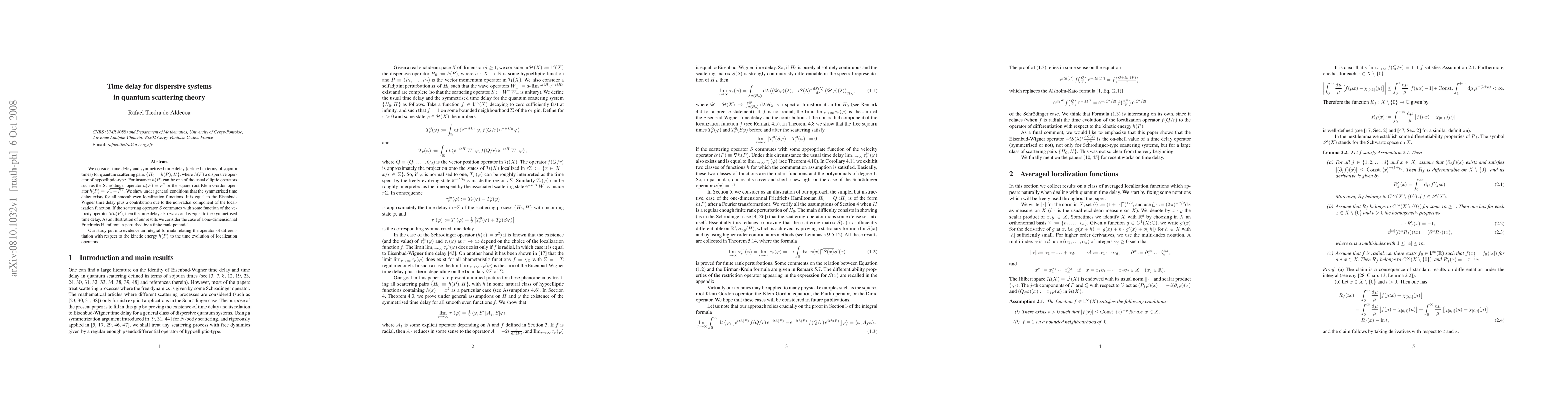 This paper investigates time delay and symmetrised time delay in quantum scattering theory for dispersive systems, showing that the symmetrised time delay exists under general conditions and relates to the Eisenbud-Wigner time delay plus a non-radial component contribution. It also demonstrates the existence of time delay when the scattering operator commutes with a function of the velocity operator.
