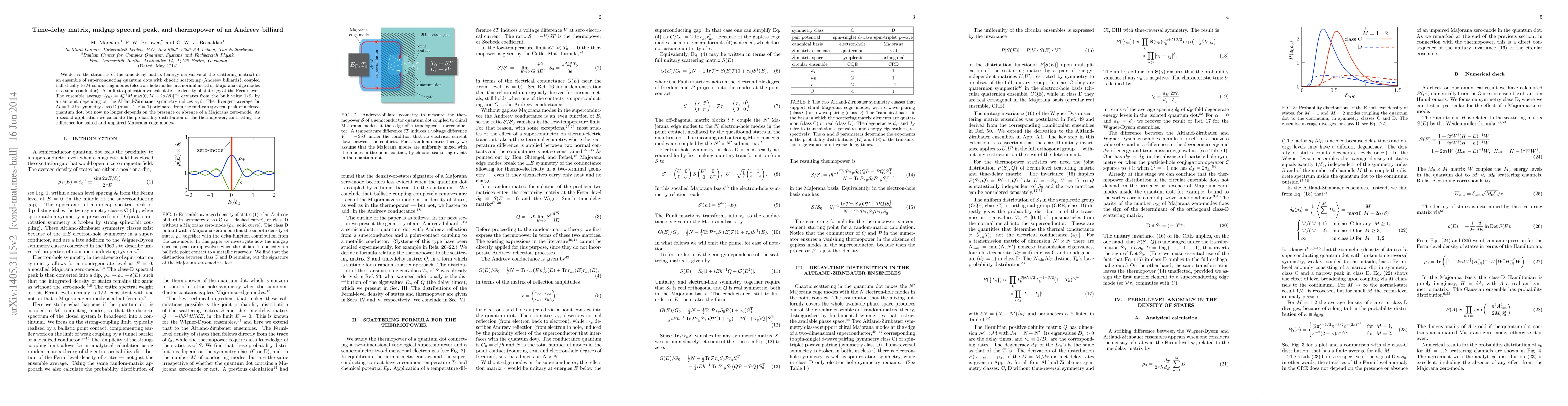 We derive the statistics of the time-delay matrix (energy derivative of the scattering matrix) in an ensemble of superconducting quantum dots with chaotic scattering (Andreev billiards), coupled ballistically to $M$ conducting modes (electron-hole modes in a normal metal or Majorana edge modes in a superconductor). As a first application we calculate the density of states $\rho_0$ at the Fermi level. The ensemble average $\langle\rho_0\rangle=\delta_0^{-1}M[\max(0,M+2\alpha/\beta)]^{-1}$ deviates from the bulk value $1/\delta_0$ by an amount depending on the Altland-Zirnbauer symmetry indices $\alpha,\beta$. The divergent average for $M=1,2$ in symmetry class D ($\alpha=-1$, $\beta=1$) originates from the mid-gap spectral peak of a closed quantum dot, but now no longer depends on the presence or absence of a Majorana zero-mode. As a second application we calculate the probability distribution of the thermopower, contrasting the difference for paired and unpaired Majorana edge modes.