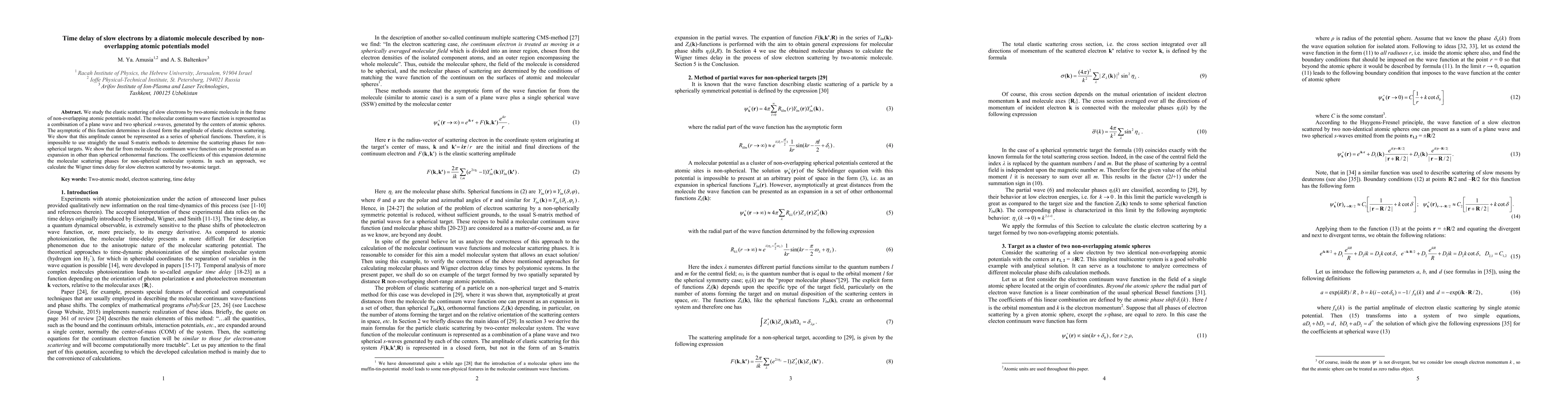 This paper investigates the elastic scattering of slow electrons by a diatomic molecule using a non-overlapping atomic potentials model. It finds that the scattering amplitude cannot be expressed as a series of spherical functions, necessitating a different approach to determine scattering phases. The authors calculate the Wigner time delay for slow electrons scattered by the molecule, using an expansion in non-spherical orthonormal functions.