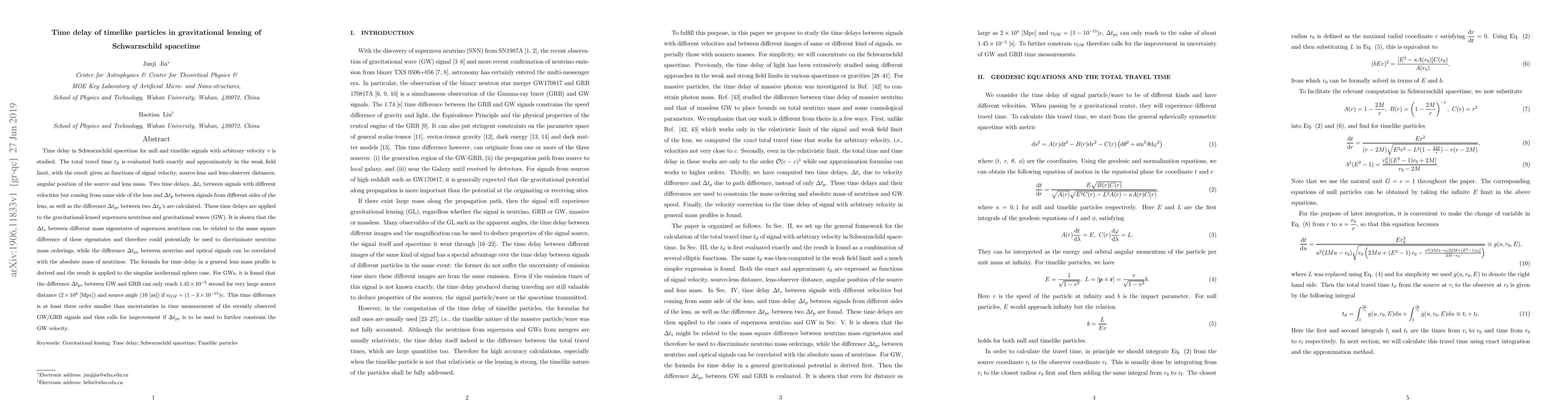 Time delay in Schwarzschild spacetime for null and timelike signals with arbitrary velocity $v$ is studied. The total travel time $t_\mathrm{if}$ is evaluated both exactly and approximately in the weak field limit, with the result given as functions of signal velocity, source-lens and lens-observer distances, angular position of the source and lens mass. Two time delays, $\Delta t_v$ between signals with different velocities but coming from same side of the lens and $\Delta t_\mathrm{p}$ between signals from different sides of the lens, as well as the difference $\Delta t_{\mathrm{p}v}$ between two $\Delta t_\mathrm{p}$'s are calculated. These time delays are applied to the gravitational-lensed supernova neutrinos and gravitational waves (GW). It is shown that the $\Delta t_v$ between different mass eigenstates of supernova neutrinos can be related to the mass square difference of these eigenstates and therefore could potentially be used to discriminate neutrino mass orderings, while the difference $\Delta t_{\mathrm{p}v}$ between neutrino and optical signals can be correlated with the absolute mass of neutrinos. The formula for time delay in a general lens mass profile is derived and the result is applied to the singular isothermal sphere case. For GWs, it is found that the difference $\Delta t_{\mathrm{p}v}$ between GW and GRB can only reach $1.45\times 10^{-5}$ second for very large source distance ($2\times 10^4$ [Mpc]) and source angle (10 [as]) if $v_{GM}=(1-3\times 10^{-15})c$. This time difference is at least three order smaller than uncertainties in time measurement of the recently observed GW/GRB signals and thus calls for improvement if $\Delta t_{\mathrm{p}v}$ is to be used to further constrain the GW velocity.