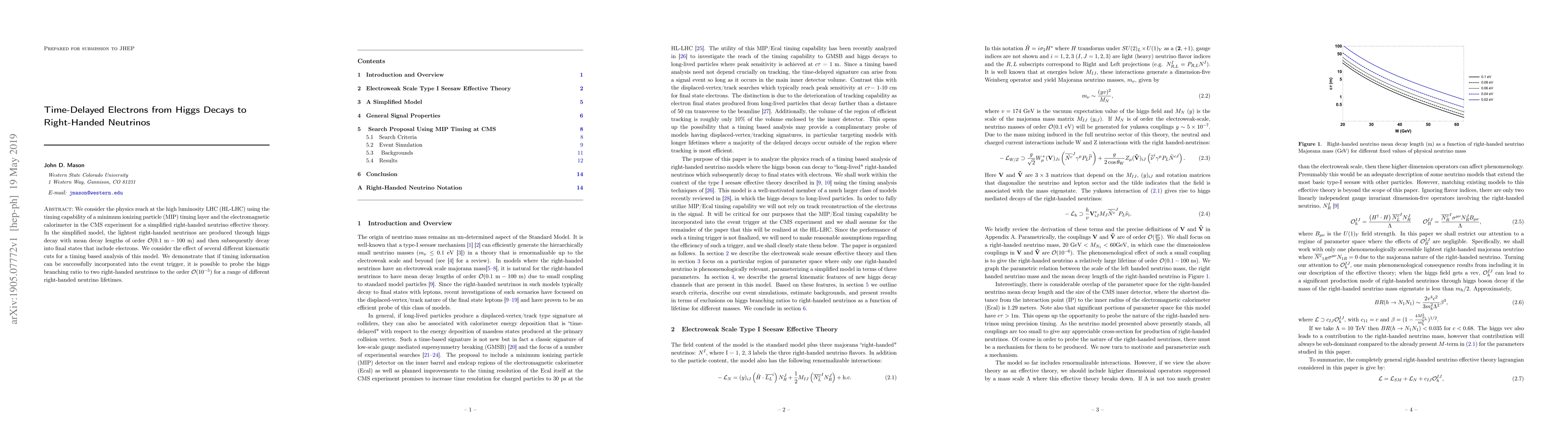 We consider the physics reach at the high luminosity LHC (HL-LHC) using the timing capability of a minimum ionizing particle (MIP) timing layer and the electromagnetic calorimeter in the CMS experiment for a simplified right-handed neutrino effective theory. In the simplified model, the lightest right-handed neutrinos are produced through higgs decay with mean decay lengths of order $\mathcal{O}(0.1~{\rm m}-100~{\rm m}$) and then subsequently decay into final states that include electrons. We consider the effect of several different kinematic cuts for a timing based analysis of this model. We demonstrate that if timing information can be successfully incorporated into the event trigger, it is possible to probe the higgs branching ratio to two right-handed neutrinos to the order $\mathcal{O}(10^{-5}) $ for a range of different right-handed neutrino lifetimes.
