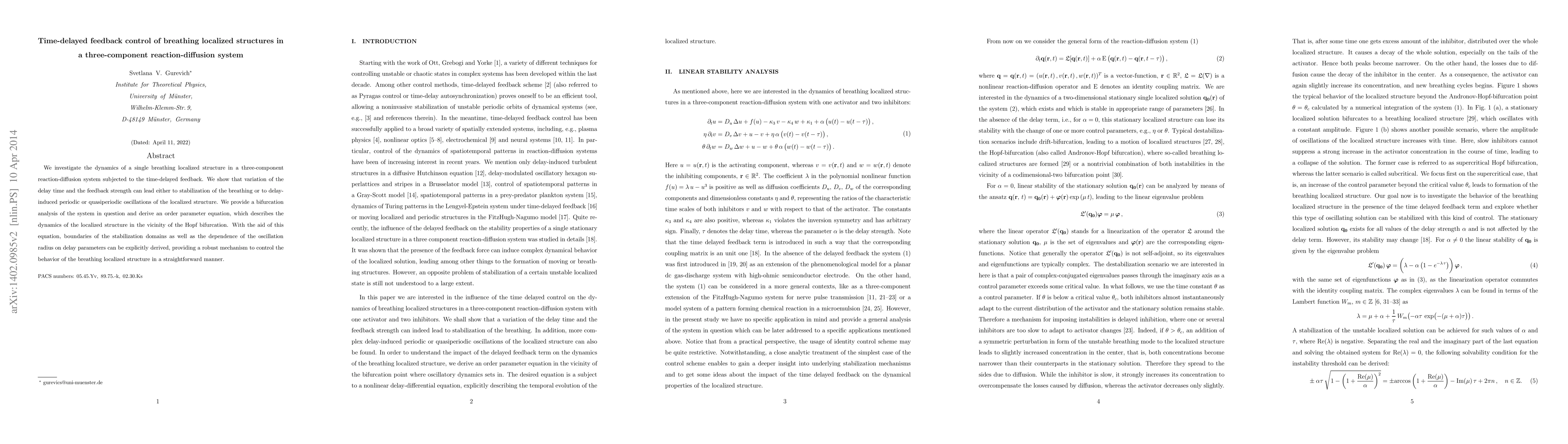 This paper explores the dynamics of a localized structure in a three-component reaction-diffusion system under time-delayed feedback, revealing how varying delay and feedback strength can stabilize or induce oscillations. A bifurcation analysis and an order parameter equation are used to explicitly determine stabilization domains and oscillation characteristics.