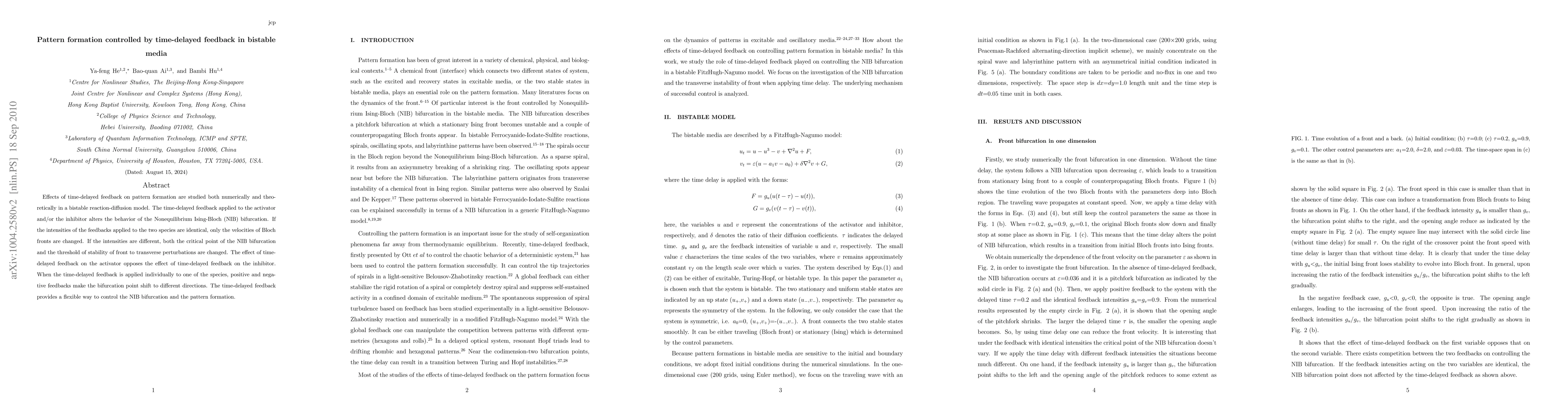 This study investigates how time-delayed-feedback influences pattern formation in symmetrical bistable media. The findings reveal that time delay shifts the critical point of the Nonequilibrium Ising-Bloch bifurcation and alters the stability of fronts, leading to transitions between spiral and labyrinthine patterns, demonstrating the potential to control pattern formation via time-delayed-feedback.