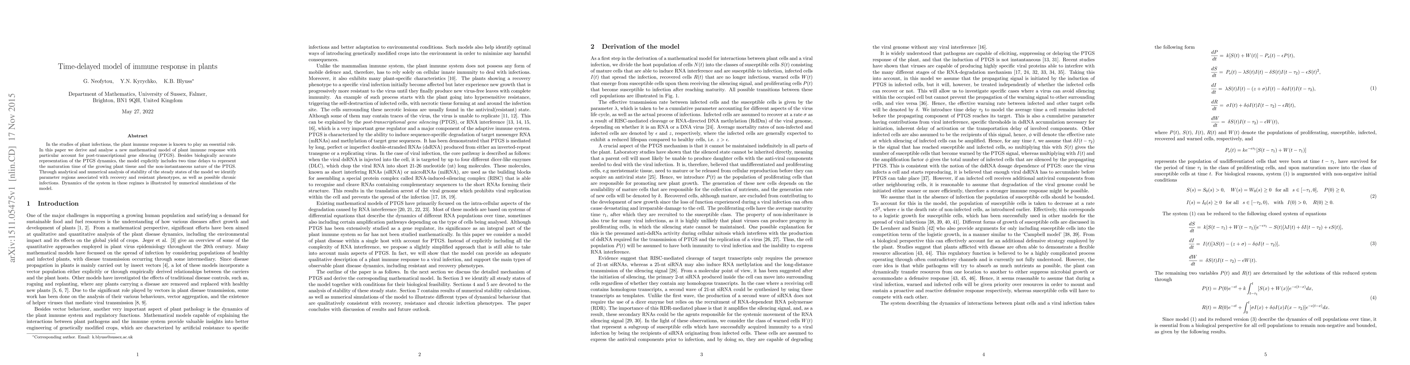This paper develops a mathematical model to describe the plant immune response, incorporating time delays for maturation and post-transcriptional gene silencing (PTGS). The model's stability analysis identifies conditions for recovery, resistance, and chronic infections, supported by numerical simulations.