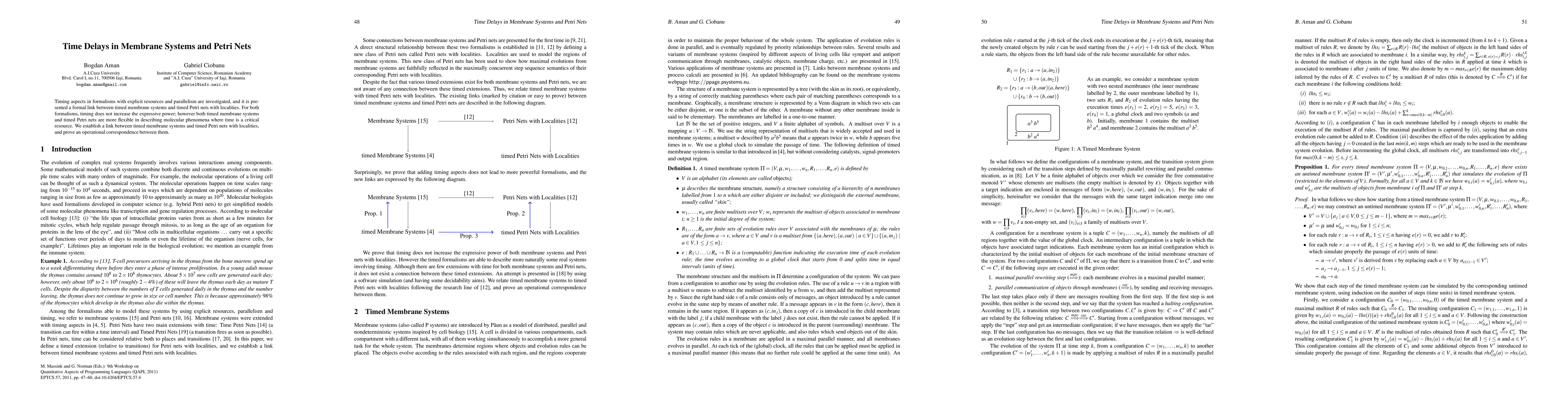 This paper explores the timing aspects of timed membrane systems and timed Petri nets with localities, establishing a formal link between them. Despite timing not enhancing expressive power, both formalisms offer flexibility in modeling time-critical molecular phenomena, with an operational correspondence proven between them.