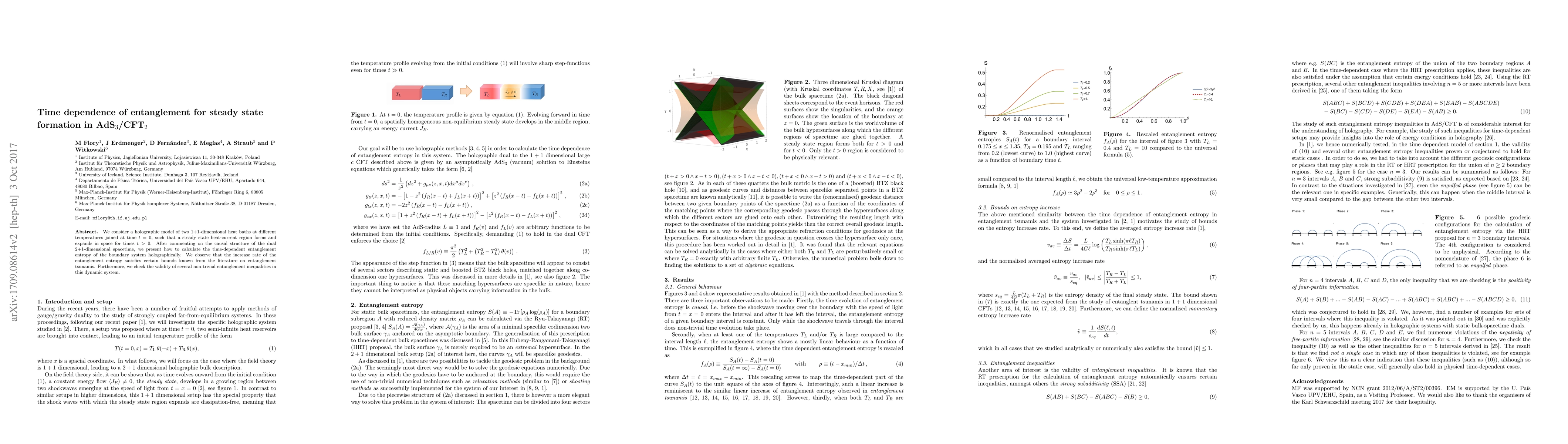 We consider a holographic model of two 1+1-dimensional heat baths at different temperatures joined at time $t=0$, such that a steady state heat-current region forms and expands in space for times $t>0$. After commenting on the causal structure of the dual 2+1-dimensional spacetime, we present how to calculate the time-dependent entanglement entropy of the boundary system holographically. We observe that the increase rate of the entanglement entropy satisfies certain bounds known from the literature on entanglement tsunamis. Furthermore, we check the validity of several non-trivial entanglement inequalities in this dynamic system.