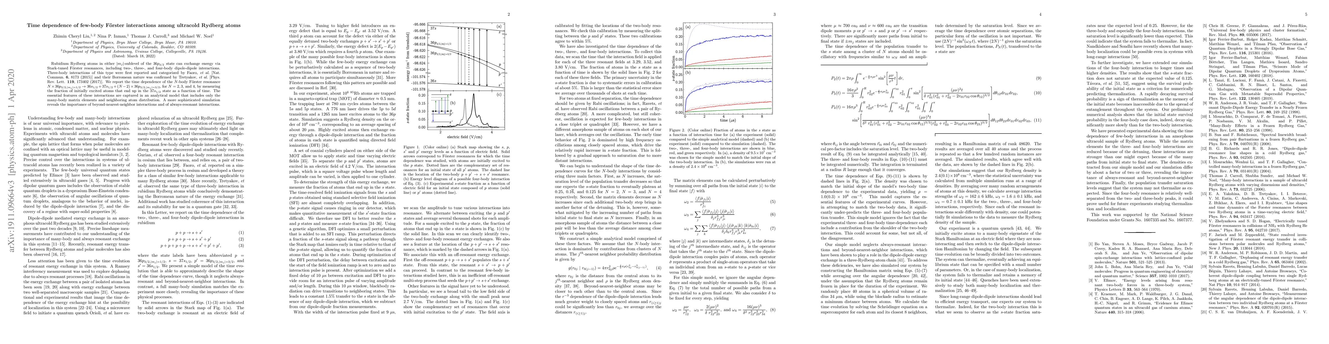 This paper investigates the time dependence of few-body F\"{o}rster resonances in ultracold Rydberg rubidium atoms, focusing on two-, three-, and four-body interactions. It measures the fraction of atoms transitioning to the $37s_{1/2}$ state over time, revealing essential features captured by an analytical model and highlighting the importance of beyond-nearest-neighbor interactions.