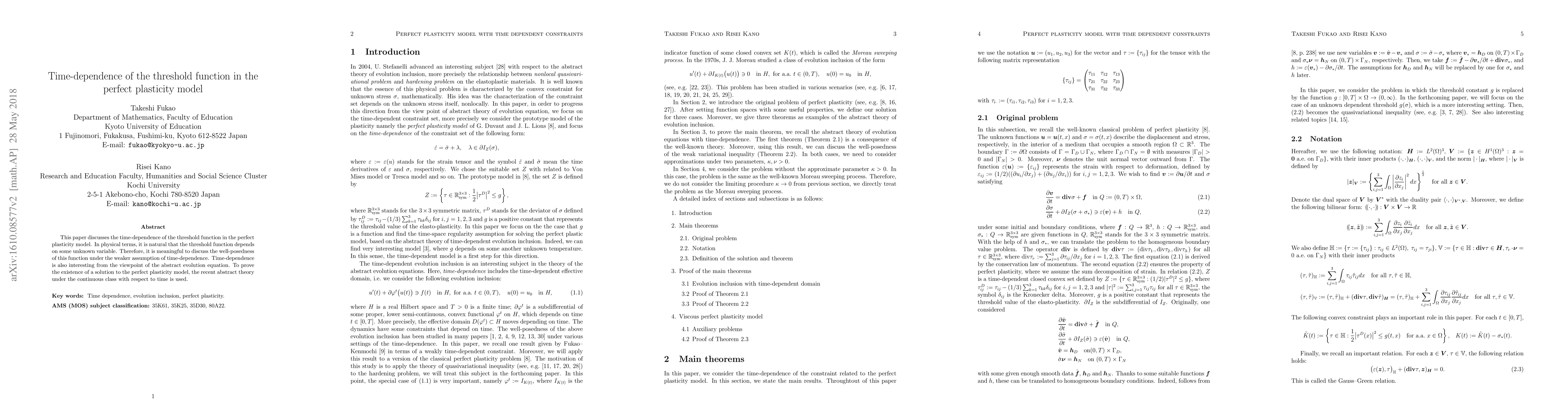 This paper discusses the time-dependence of the threshold function in the perfect plasticity model. In physical terms, it is natural that the threshold function depends on some unknown variable. Therefore, it is meaningful to discuss the well-posedness of this function under the weaker assumption of time-dependence. Time-dependence is also interesting from the viewpoint of the abstract evolution equation. To prove the existence of a solution to the perfect plasticity model, the recent abstract theory under the continuous class with respect to time is used.