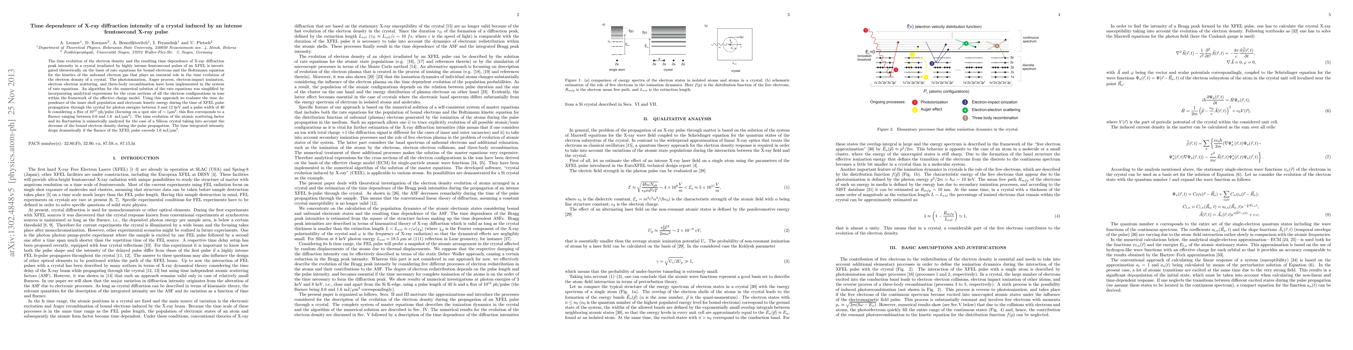 This paper investigates the time-dependent changes in X-ray diffraction intensity in a crystal under intense femtosecond XFEL pulses, using theoretical models that incorporate photoionization and electron-ion interactions. The study reveals significant drops in time-integrated intensity when XFEL pulse fluence exceeds 1.6 mJ/µm².