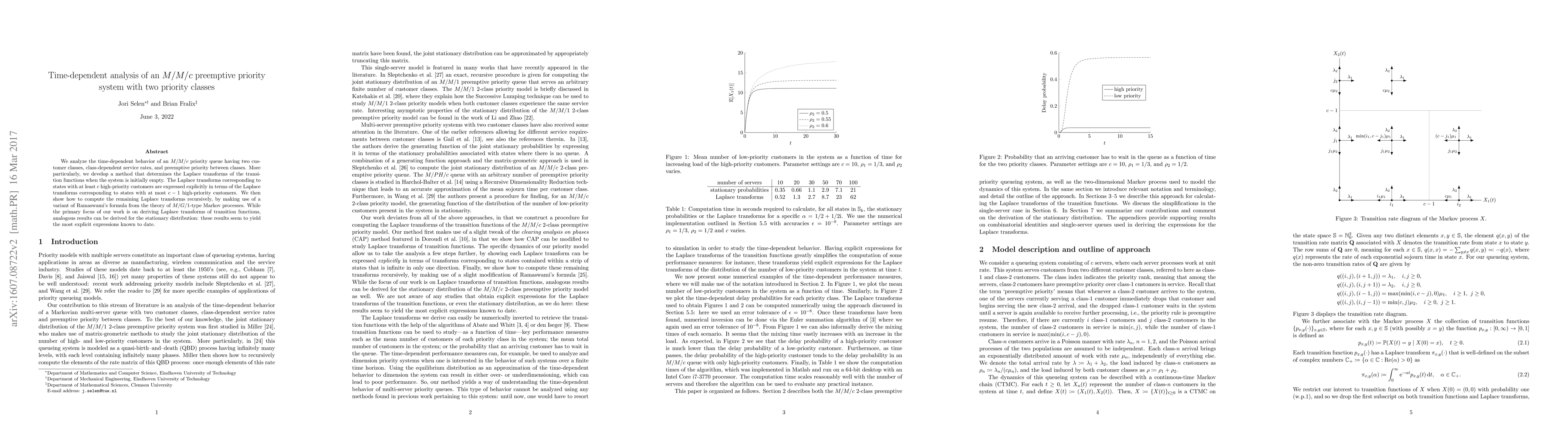 This paper develops a method to analyze the time-dependent behavior of an $M/M/c$ preemptive priority queue with two customer classes, deriving explicit Laplace transforms for transition functions and providing the most explicit expressions for the stationary distribution to date.