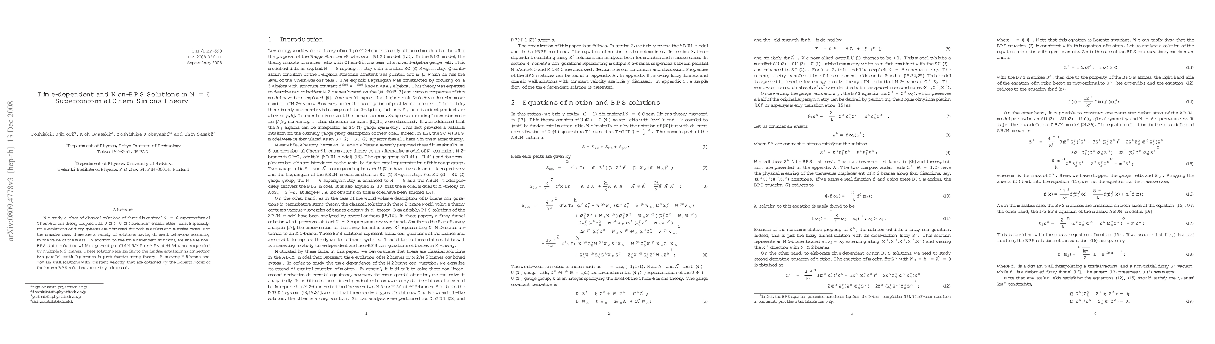 This paper investigates classical solutions in three-dimensional N=6 superconformal Chern-Simons theory, focusing on time-dependent evolutions of fuzzy spheres for both massless and massive cases. It also explores non-BPS static solutions resembling M5/M5 or M5/anti-M5-branes connected by M2-branes, along with Lorentz-boosted M5-brane and domain wall solutions.