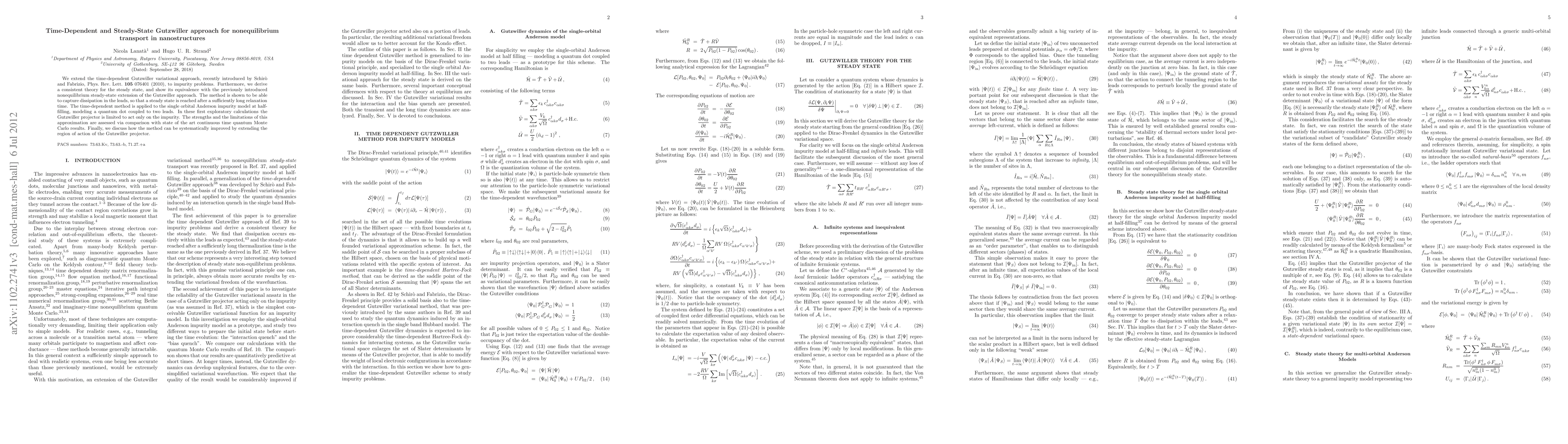 This paper extends the time-dependent Gutzwiller variational approach to impurity problems and derives a consistent theory for steady-state nonequilibrium transport in nanostructures. The method captures dissipation and is applied to the Anderson impurity model, showing promising results compared to quantum Monte Carlo simulations.
