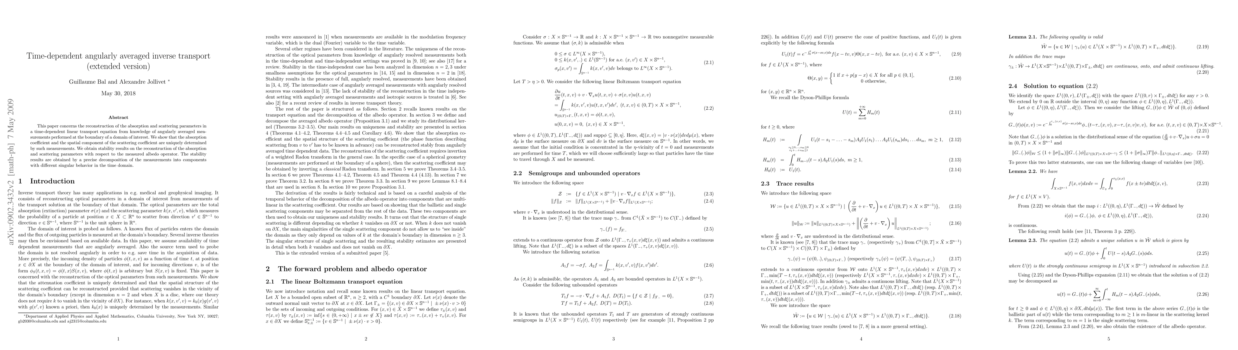 This paper concerns the reconstruction of the absorption and scattering parameters in a time-dependent linear transport equation from knowledge of angularly averaged measurements performed at the boundary of a domain of interest. We show that the absorption coefficient and the spatial component of the scattering coefficient are uniquely determined by such measurements. We obtain stability results on the reconstruction of the absorption and scattering parameters with respect to the measured albedo operator. The stability results are obtained by a precise decomposition of the measurements into components with different singular behavior in the time domain.