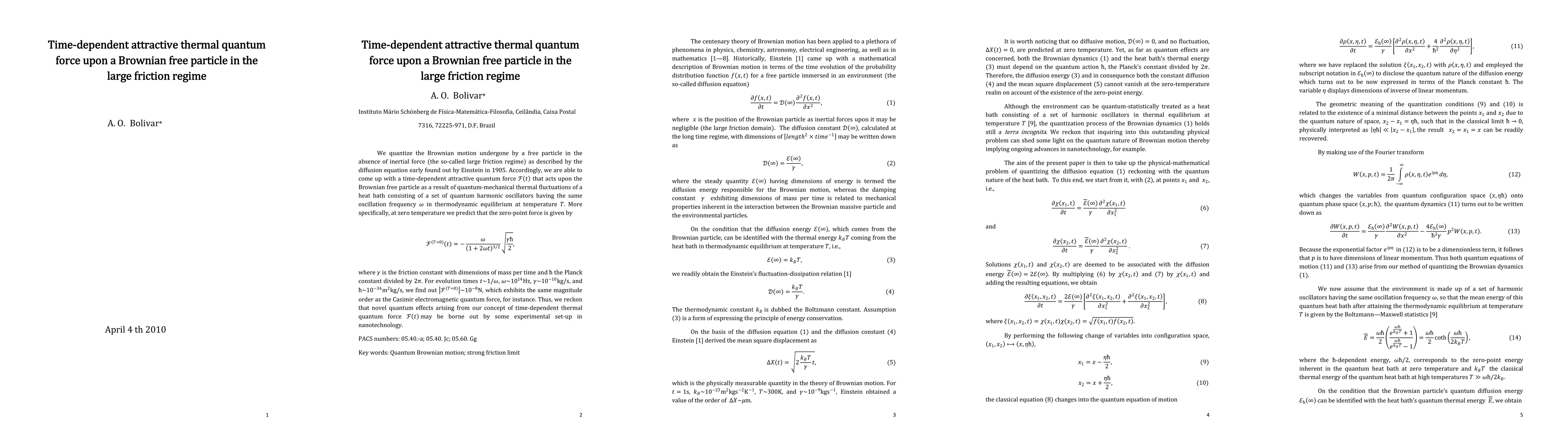 We quantize the Brownian motion undergone by a free particle in the absence of inertial force (the so-called large friction regime) as described by the diffusion equation early found out by Einstein in 1905. Accordingly, we are able to come up with a time-dependent attractive quantum force F(t) that acts upon the Brownian free particle as a result of quantum-mechanical thermal fluctuations of a heat bath consisting of a set of quantum harmonic oscillators having the same oscillation frequency /omega in thermodynamic equilibrium at temperature T. More specifically, at zero temperature we predict that the zero-point force is given by F^((T=0)) (t)=-[\omega/(1+2\omegat)^(3/2)] \sqrt(\gamma/2), where \gamma is the friction constant with dimensions of mass per time and /eta the Planck constant divided by 2\pi. For evolution times t~1/\omega, \omega~0^14 Hz, /gamma~10^(-10) kg/s, and /eta~10^(-34) m^2 kg/s, we find out F^((T=0)) ~10^(-8) N, which exhibits the same magnitude order as the Casimir electromagnetic quantum force, for instance. Thus, we reckon that novel quantum effects arising from our concept of time-dependent thermal quantum force F(t) may be borne out by some experimental set-up in nanotechnology.