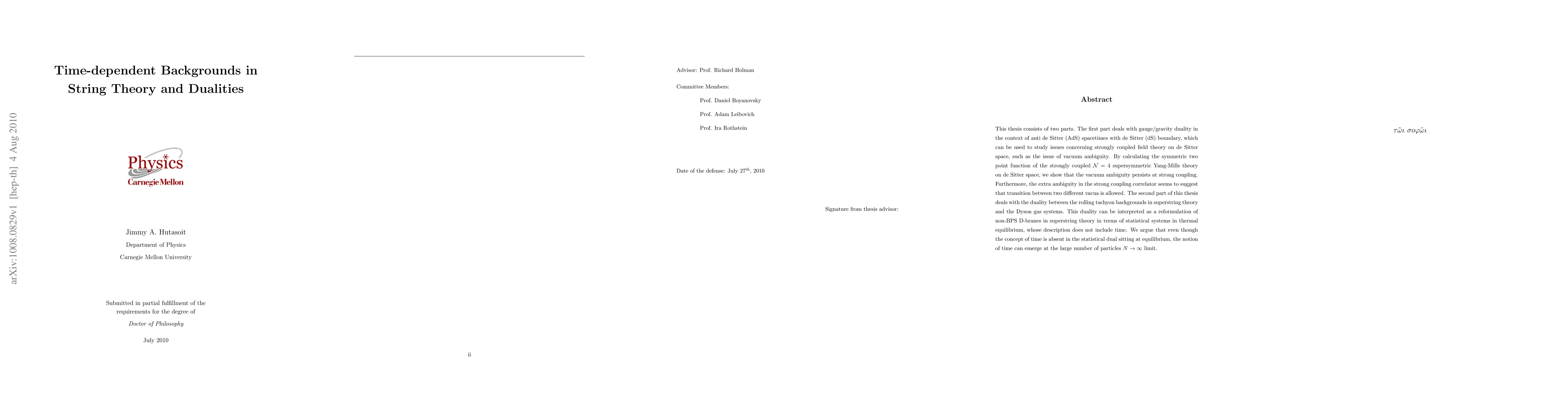 This thesis consists of two parts. The first part deals with gauge/gravity duality in the context of anti de Sitter (AdS) spacetimes with de Sitter (dS) boundary, which can be used to study issues concerning strongly coupled field theory on de Sitter space, such as the issue of vacuum ambiguity. By calculating the symmetric two point function of the strongly coupled ${\cal N} = 4$ supersymmetric Yang-Mills theory on de Sitter space, we show that the vacuum ambiguity persists at strong coupling. Furthermore, the extra ambiguity in the strong coupling correlator seems to suggest that transition between two different vacua is allowed. The second part of this thesis deals with the duality between the rolling tachyon backgrounds in superstring theory and the Dyson gas systems. This duality can be interpreted as a reformulation of non-BPS D-branes in superstring theory in terms of statistical systems in thermal equilibrium, whose description does not include time. We argue that even though the concept of time is absent in the statistical dual sitting at equilibrium, the notion of time can emerge at the large number of particles $N \rightarrow \infty$ limit.