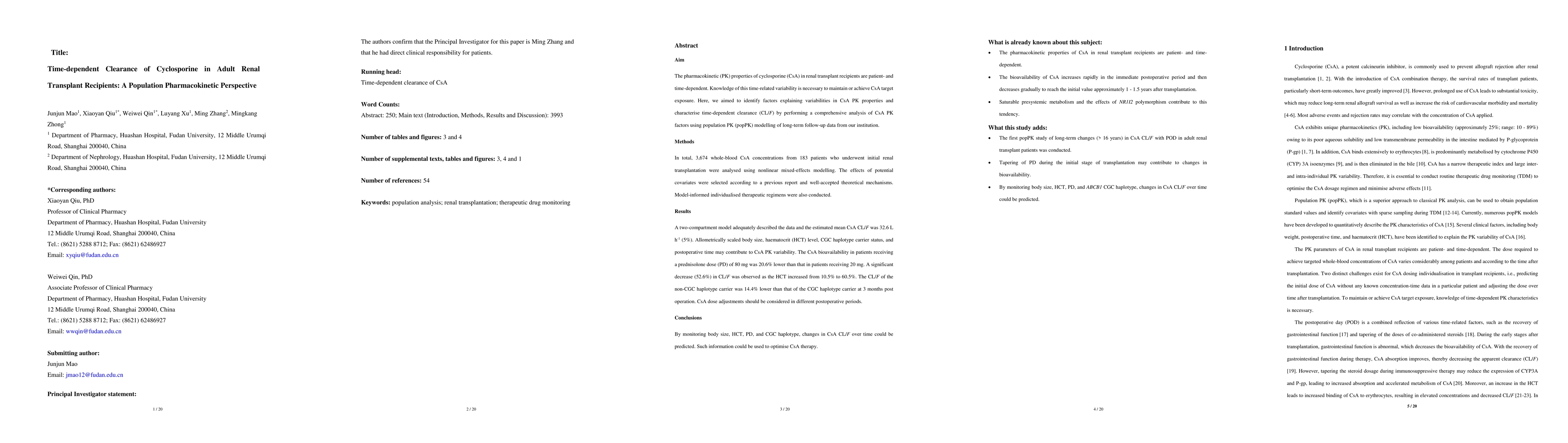 Aim The pharmacokinetic (PK) properties of cyclosporine (CsA) in renal transplant recipients are patient- and time-dependent. Knowledge of this time-related variability is necessary to maintain or achieve CsA target exposure. Here, we aimed to identify factors explaining variabilities in CsA PK properties and characterise time-dependent clearance (CL/F) by performing a comprehensive analysis of CsA PK factors using population PK (popPK) modelling of long-term follow-up data from our institution. Methods In total, 3,674 whole-blood CsA concentrations from 183 patients who underwent initial renal transplantation were analysed using nonlinear mixed-effects modelling. The effects of potential covariates were selected according to a previous report and well-accepted theoretical mechanisms. Model-informed individualised therapeutic regimens were also conducted. Results A two-compartment model adequately described the data and the estimated mean CsA CL/F was 32.6 L h-1 (5%). Allometrically scaled body size, haematocrit (HCT) level, CGC haplotype carrier status, and postoperative time may contribute to CsA PK variability. The CsA bioavailability in patients receiving a prednisolone dose (PD) of 80 mg was 20.6% lower than that in patients receiving 20 mg. A significant decrease (52.6%) in CL/F was observed as the HCT increased from 10.5% to 60.5%. The CL/F of the non-CGC haplotype carrier was 14.4% lower than that of the CGC haplotype carrier at 3 months post operation. CsA dose adjustments should be considered in different postoperative periods. Conclusions By monitoring body size, HCT, PD, and CGC haplotype, changes in CsA CL/F over time could be predicted. Such information could be used to optimise CsA therapy.