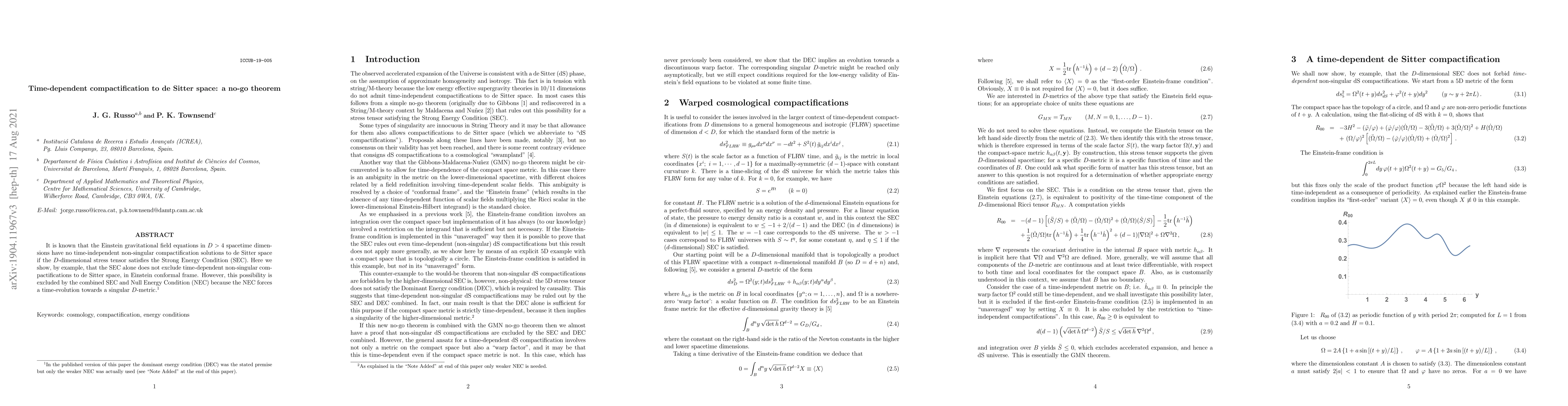 This paper demonstrates that while the Strong Energy Condition (SEC) alone does not preclude time-dependent compactifications to de Sitter space, the combined SEC and Null Energy Condition (NEC) rule out such possibilities by necessitating a singular $D$-metric evolution.