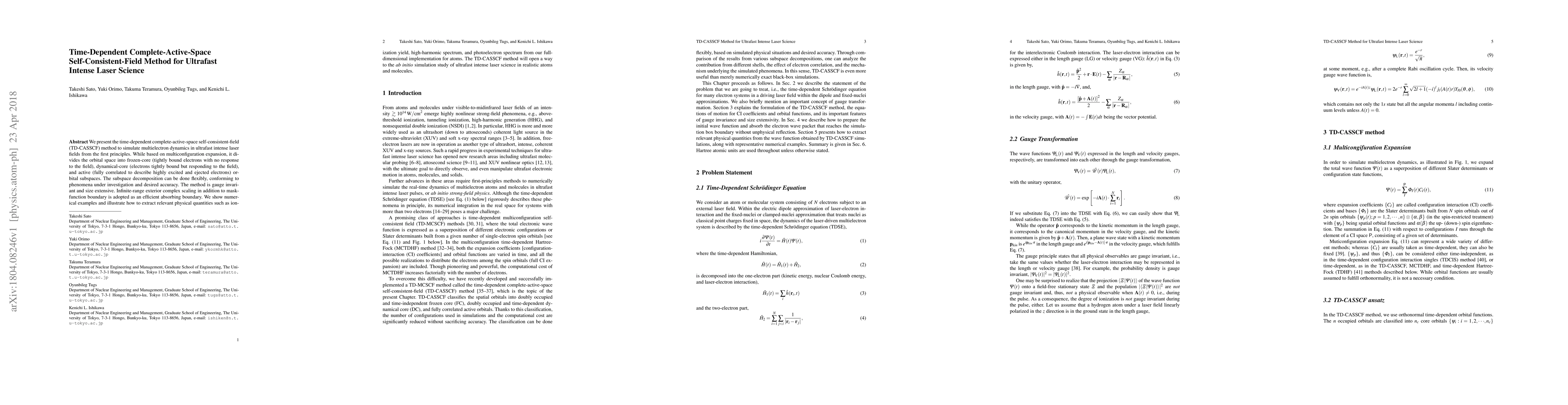 The paper introduces the time-dependent complete-active-space self-consistent-field (TD-CASSCF) method for simulating ultrafast intense laser interactions, dividing orbital space into frozen, dynamical, and active subspaces. The method is gauge invariant and uses complex scaling for absorbing boundaries, enabling accurate extraction of ionization yield and high-harmonic spectra.