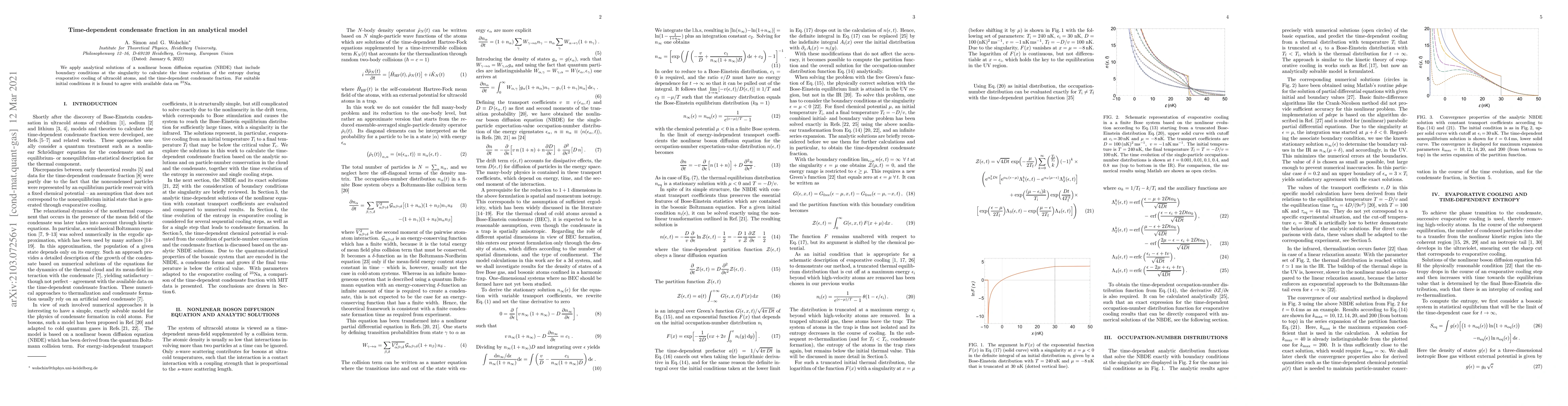 We apply analytical solutions of a nonlinear boson diffusion equation (NBDE) that include boundary conditions at the singularity to calculate the time evolution of the entropy during evaporative cooling of ultracold atoms, and the time-dependent condensate fraction. For suitable initial conditions it is found to agree with available data on Na-23.