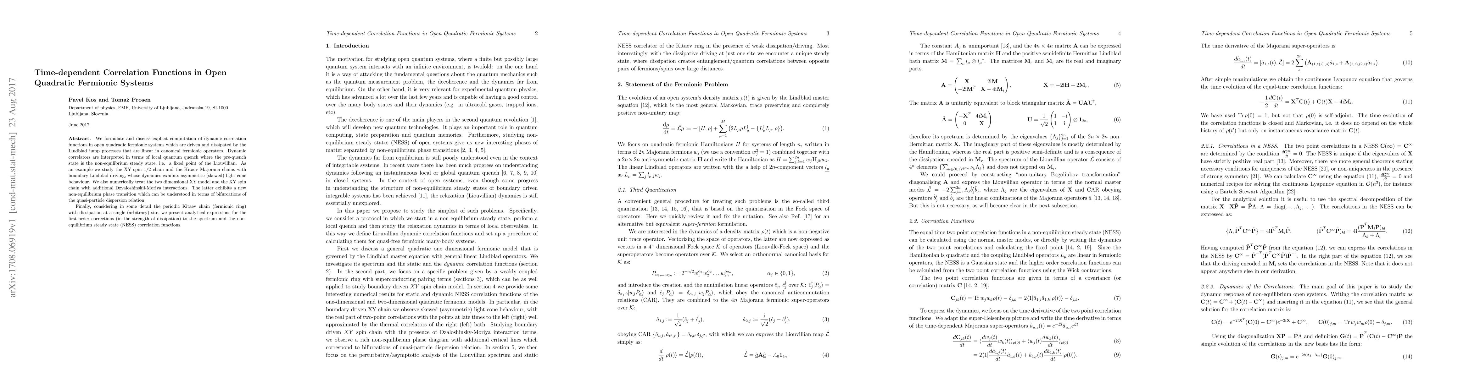 We formulate and discuss explicit computation of dynamic correlation functions in open quadradic fermionic systems which are driven and dissipated by the Lindblad jump processes that are linear in canonical fermionic operators. Dynamic correlators are interpreted in terms of local quantum quench where the pre-quench state is the non-equilibrium steady state, i.e. a fixed point of the Liouvillian. As an example we study the XY spin 1/2 chain and the Kitaev Majorana chains with boundary Lindblad driving, whose dynamics exhibits asymmetric (skewed) light cone behaviour. We also numerically treat the two dimensional XY model and the XY spin chain with additional Dzyaloshinskii-Moriya interactions. The latter exhibits a new non-equilibrium phase transition which can be understood in terms of bifurcations of the quasi-particle dispersion relation. Finally, considering in some detail the periodic Kitaev chain (fermionic ring) with dissipation at a single (arbitrary) site, we present analytical expressions for the first order corrections (in the strength of dissipation) to the spectrum and the non-equilibrium steady state (NESS) correlation functions.