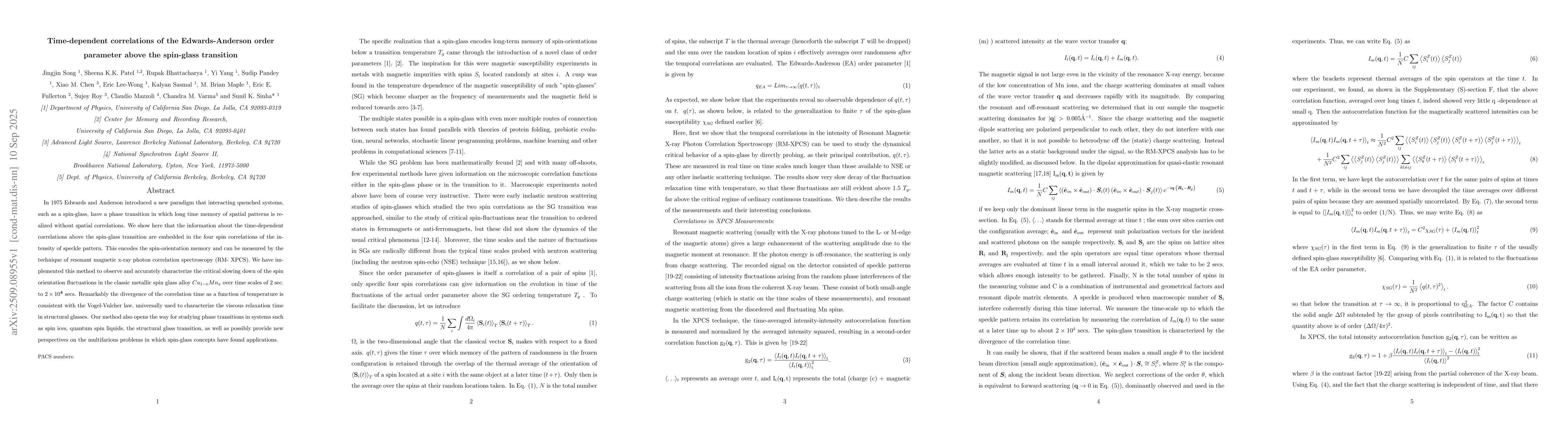 In 1975 Edwards and Anderson introduced a new paradigm that interacting quenched systems, such as a spin-glass, have a phase transition in which long time memory of spatial patterns is realized without spatial correlations. We show here that the information about the time-dependent correlations above the spin-glass transition are embedded in the four spin correlations of the intensity of speckle pattern. This encodes the spin-orientation memory and can be measured by the technique of resonant magnetic x-ray photon correlation spectroscopy (RM- XPCS). We have implemented this method to observe and accurately characterize the critical slowing down of the spin orientation fluctuations in the classic metallic spin glass alloy $Cu_{1-x}{Mn}_x$ over time scales of ${2}$ sec. to $2 \times 10^{\mathbf{4}}$ secs. Remarkably the divergence of the correlation time as a function of temperature is consistent with the Vogel-Vulcher law, universally used to characterize the viscous relaxation time in structural glasses. Our method also opens the way for studying phase transitions in systems such as spin ices, quantum spin liquids, the structural glass transition, as well as possibly provide new perspectives on the multifarious problems in which spin-glass concepts have found applications.
