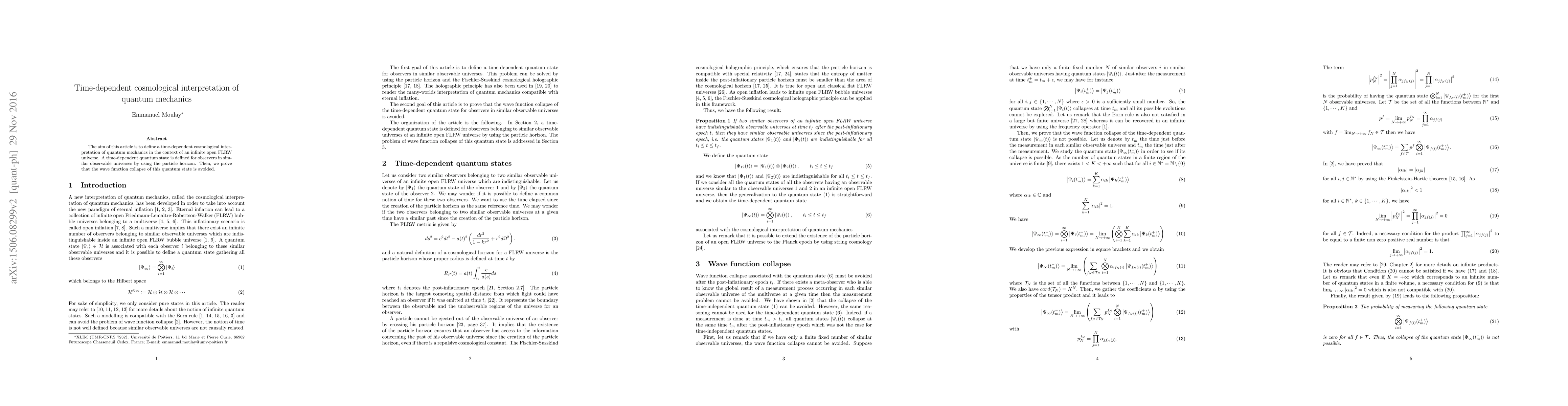 This paper proposes a time-dependent cosmological interpretation of quantum mechanics in an infinite open FLRW universe, defining a time-dependent quantum state for observers within similar observable universes using the particle horizon, and demonstrating that wave function collapse is thereby avoided.