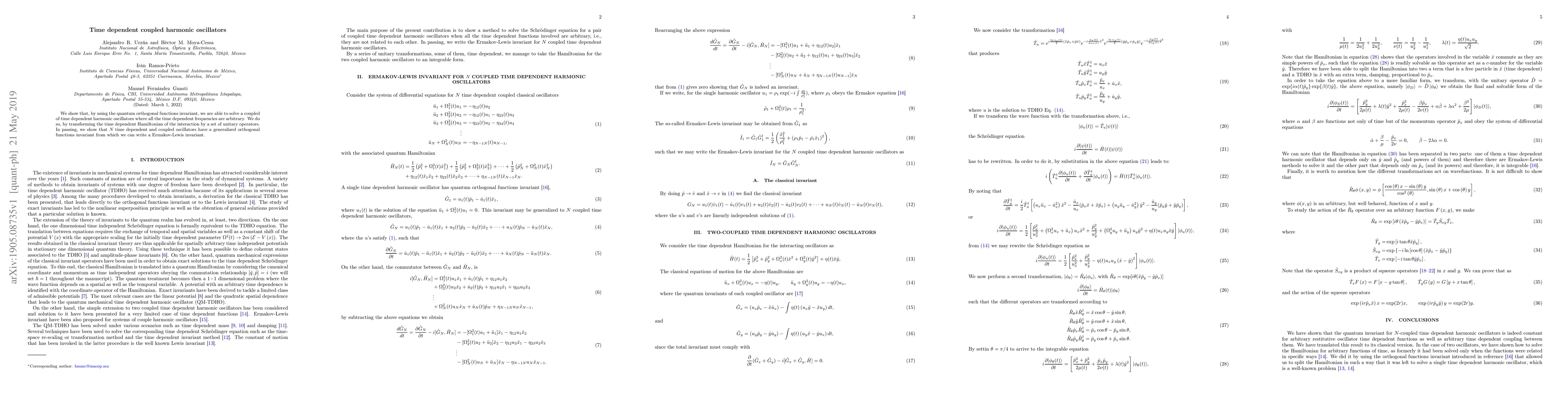We show that, by using the quantum orthogonal functions invariant, we are able to solve a coupled of time dependent harmonic oscillators where all the time dependent frequencies are arbitrary. We do so, by transforming the time dependent Hamiltonian of the interaction by a set of unitary operators. In passing, we show that $N$ time dependent and coupled oscillators have a generalized orthogonal functions invariant from which we can write a Ermakov-Lewis invariant.