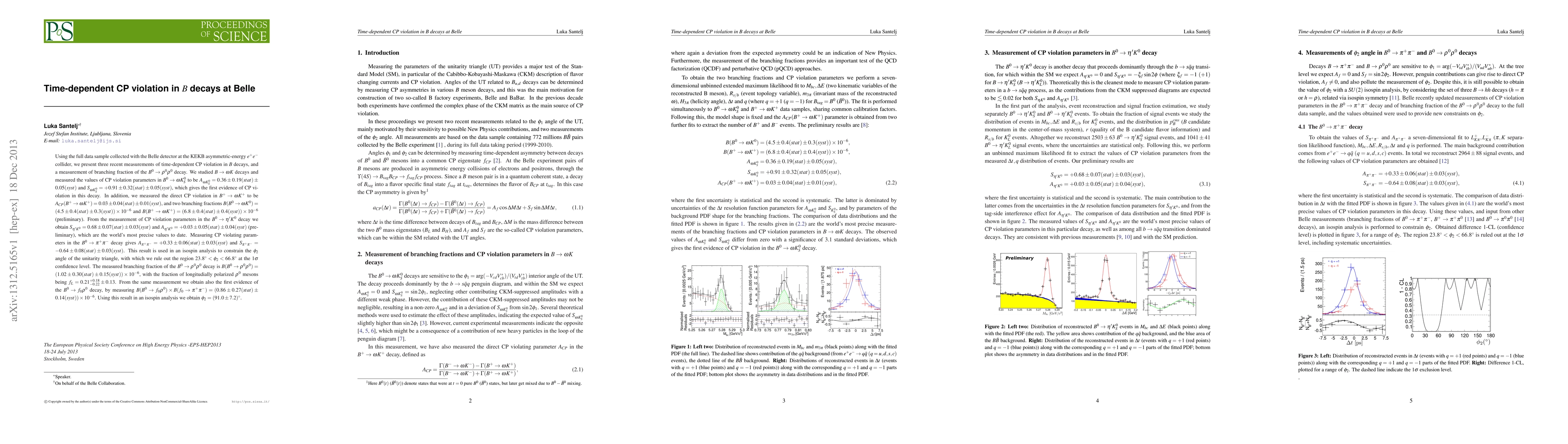 Using the full data sample collected with the Belle detector at the KEKB asymmetric-energy $e^+e^-$ collider, we present three recent measurements of time-dependent CP violation in $B$ decays, and a measurement of branching fraction of the $B^0\to\rho^0\rho^0$ decay. We studied $B\to\omega K$ decays and measured the values of CP violation parameters in $B^0\to\omega K^0_S$ to be $A_{\omega K^0_S} =-0.36\pm 0.19(stat)\pm 0.05(syst)$ and $S_{\omega K^0_S}= +0.91\pm 0.32 \pm 0.05 $, which gives the first evidence of CP violation in this decay. In addition, we measured the direct CP violation in $B^+\to\omega K^+$ to be $A_{CP} (B^+ \to \omega K^+)=-0.03\pm 0.04 \pm 0.01$, and two branching fractions $B(B^0 \to \omega K^0)=(4.5\pm 0.4\pm 0.3) \times 10^{-6}$ and $B(B^+ \to \omega K^+)=(6.8\pm 0.4 \pm 0.4) \times 10^{-6}$ (preliminary). From the measurement of CP violation parameters in the $B^0\to\eta'K^0$ decay we obtain $S_{\eta'K^0} = 0.68 \pm 0.07\pm 0.03$ and $A_{\eta'K^0} = +0.03 \pm 0.05\pm 0.04$ (preliminary), which are the world's most precise values to date. Measuring CP violating parameters in the $B^0\to\pi^+\pi^-$ decay gives $A_{\pi^+\pi^-} = +0.33\pm 0.06\pm 0.03$ and $S_{\pi^+\pi^-} = -0.64\pm 0.08\pm 0.03$. This result is used in an isospin analysis to constrain the $\phi_2$ angle of the unitarity triangle, with which we rule out the region $23.8^\circ < \phi_2 < 66.8^\circ$ at the $1\sigma$ confidence level. The measured branching fraction of the $B^0\to\rho^0\rho^0$ decay is $B(B^0\to\rho^0\rho^0) = (1.02\pm 0.30\pm 0.15)\times 10^{-6}$, with the fraction of longitudinally polarized $\rho^0$ mesons being $f_L = 0.21^{+0.18}_{-0.22}\pm 0.13$. We obtain also the first evidence of the $B^0\to f_0\rho^0$ decay, by measuring $B(B^0\to f_0 \rho^0)\times B(f_0\to \pi^+\pi^-) = (0.86\pm 0.27 \pm 0.14)\times 10^{-6}$.