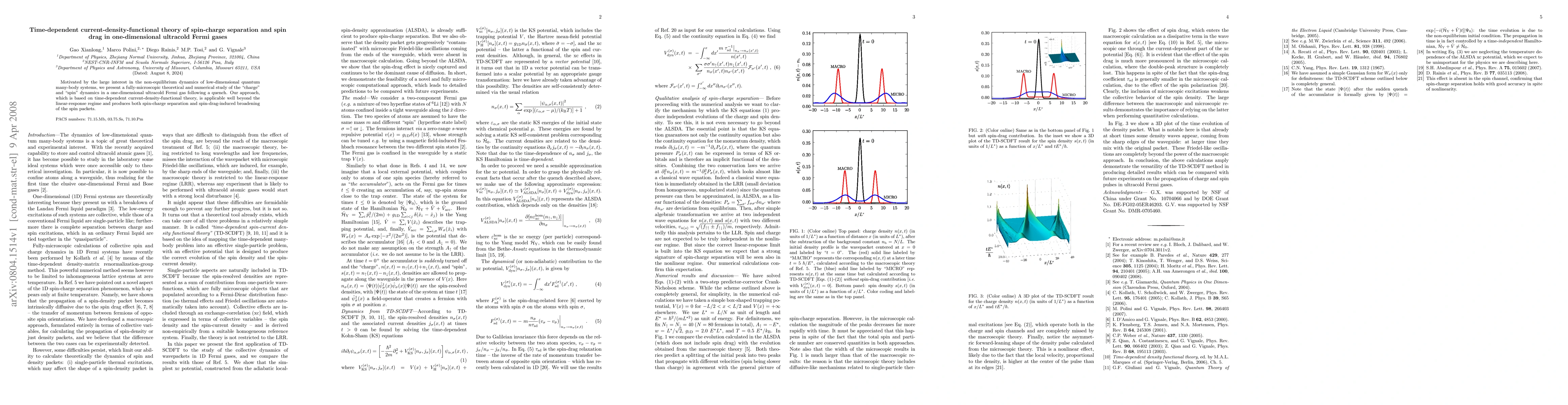 Motivated by the large interest in the non-equilibrium dynamics of low-dimensional quantum many-body systems, we present a fully-microscopic theoretical and numerical study of the "charge" and "spin" dynamics in a one-dimensional ultracold Fermi gas following a quench. Our approach, which is based on time-dependent current-density-functional theory, is applicable well beyond the linear-response regime and produces both spin-charge separation and spin-drag-induced broadening of the spin packets.