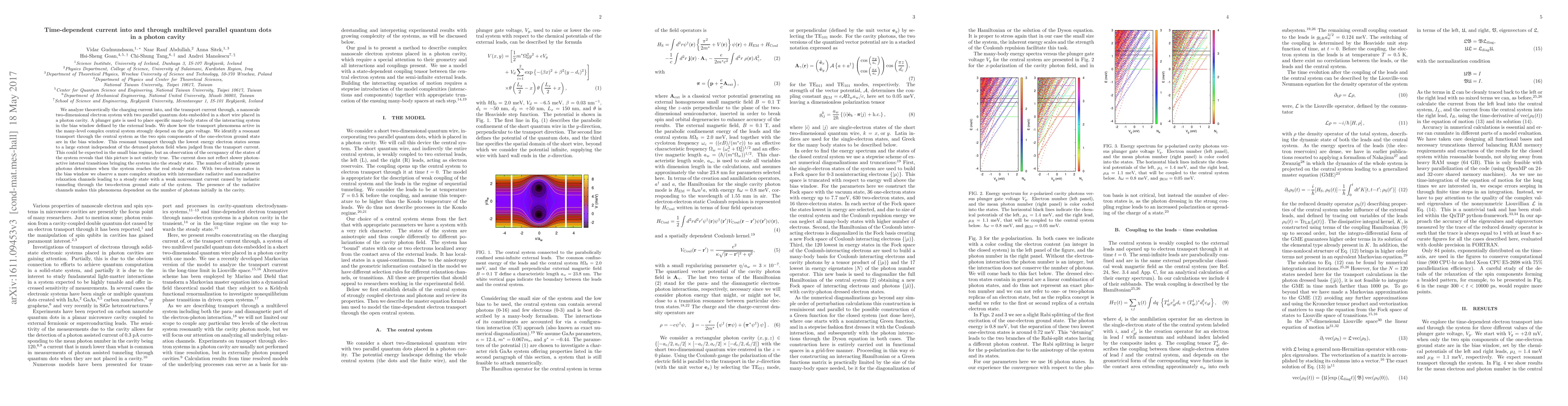 We analyze theoretically the charging current into, and the transport current through, a nanoscale two-dimensional electron system with two parallel quantum dots embedded in a short wire placed in a photon cavity. A plunger gate is used to place specific many-body states of the interacting system in the bias window defined by the external leads. We show how the transport phenomena active in the many-level complex central system strongly depend on the gate voltage. We identify a resonant transport through the central system as the two spin components of the one-electron ground state are in the bias window. This resonant transport through the lowest energy electron states seems to a large extent independent of the detuned photon field when judged from the transport current. This could be expected in the small bias regime, but an observation of the occupancy of the states of the system reveals that this picture is not entirely true. The current does not reflect slower photon-active internal transitions bringing the system into the steady state. The number of initially present photons determines when the system reaches the real steady state. With two-electron states in the bias window we observe a more complex situation with intermediate radiative and nonradiative relaxation channels leading to a steady state with a weak nonresonant current caused by inelastic tunneling through the two-electron ground state of the system. The presence of the radiative channels makes this phenomena dependent on the number of photons initially in the cavity.